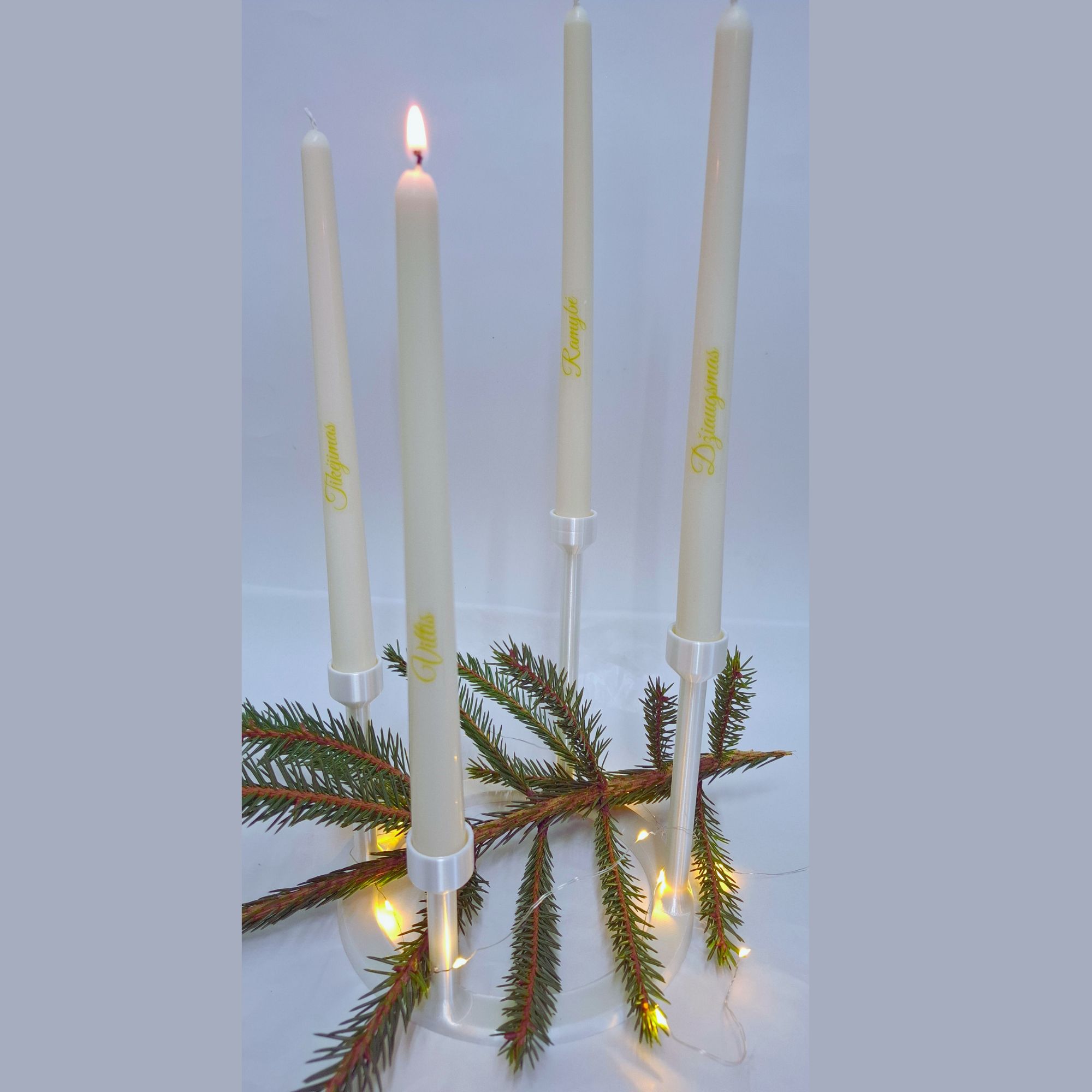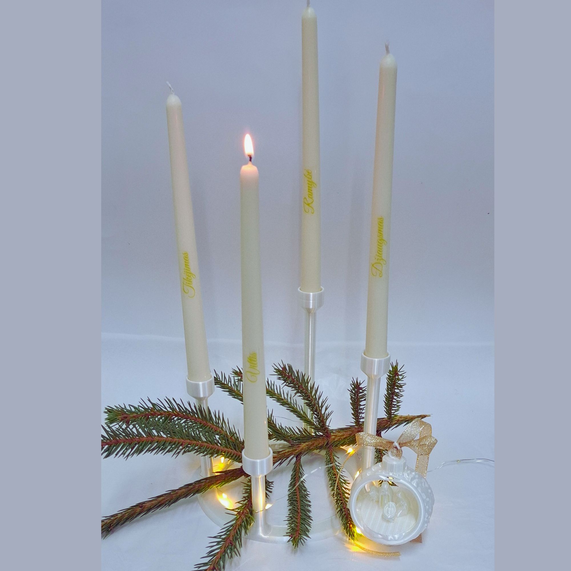 • 4 baltos, bičių vaško plonos žvakės su užrašais.