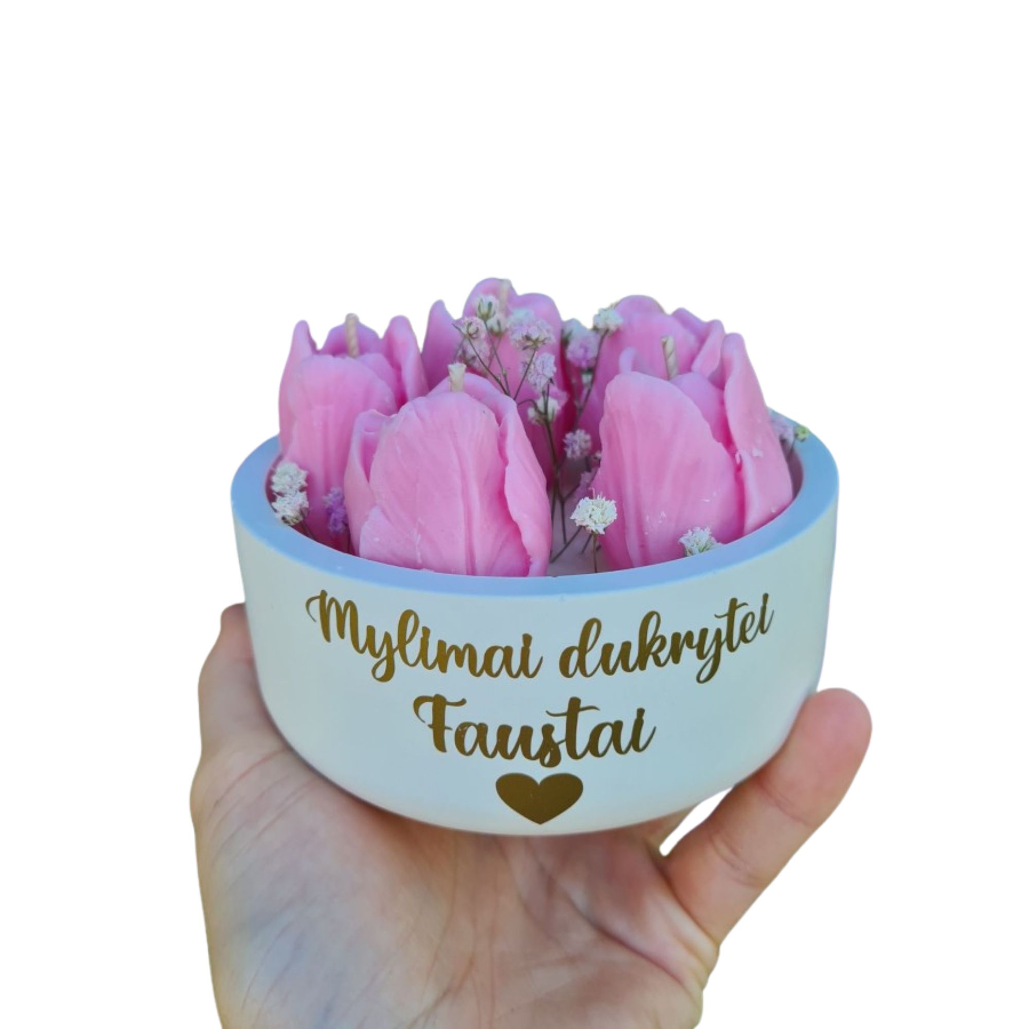Ši rankų darbo žvakė „Tulpių žiedai“ – tai švelni ir išskirtinė dovana mylimai dukrai.