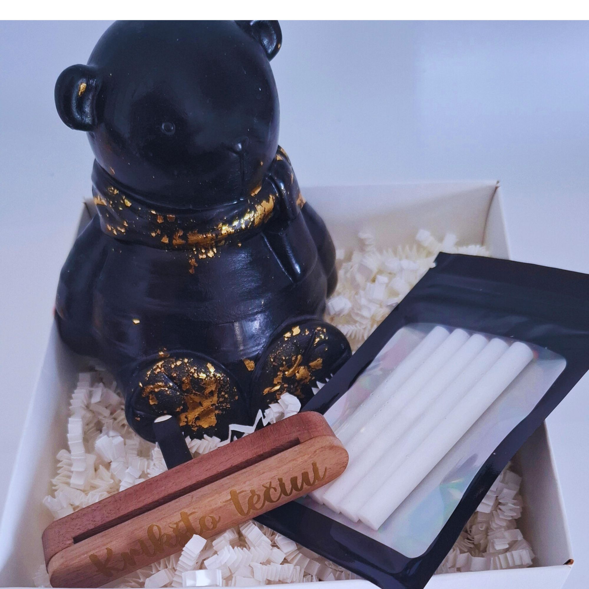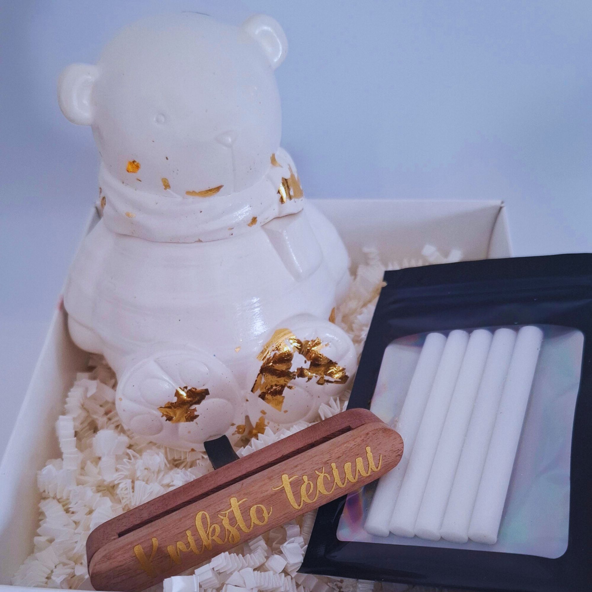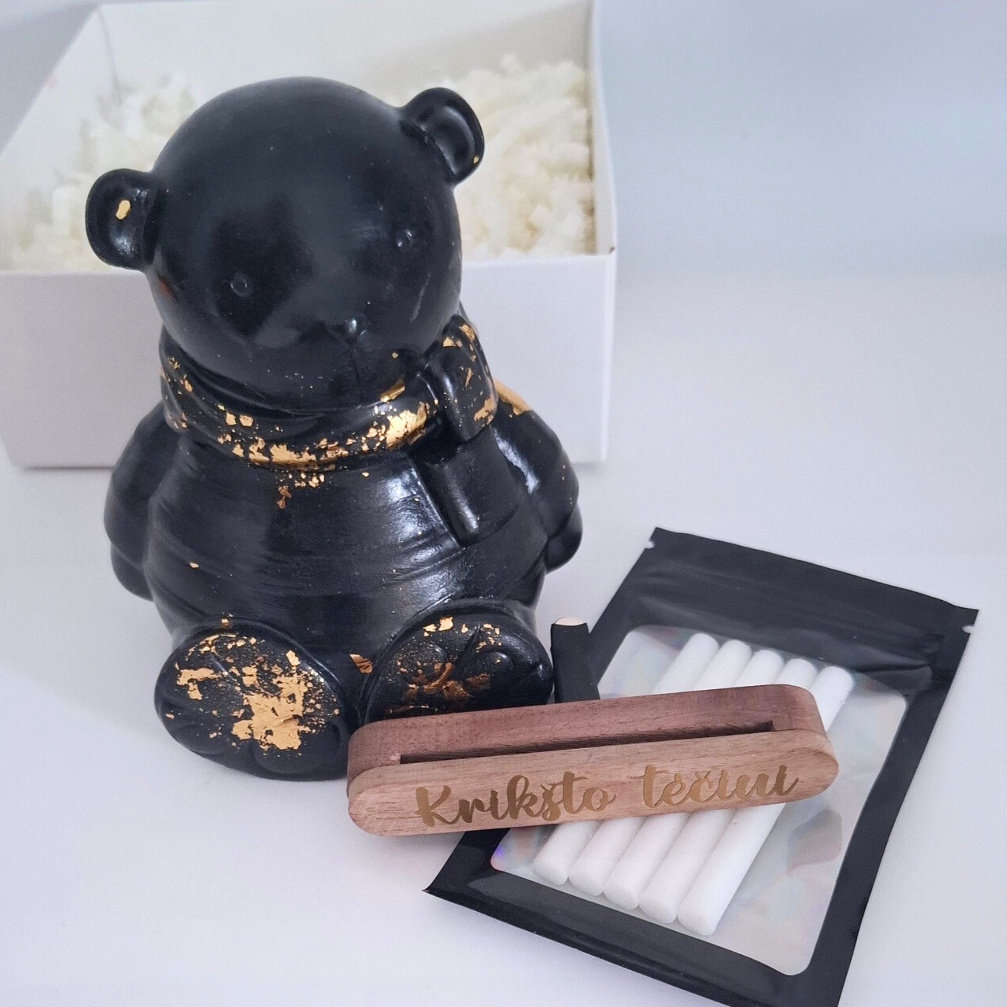 Komplekte auto kvapo laikiklis, 4 sausi kvapnūs pagaliukai ir žvakė meškučio formos indelyje.
