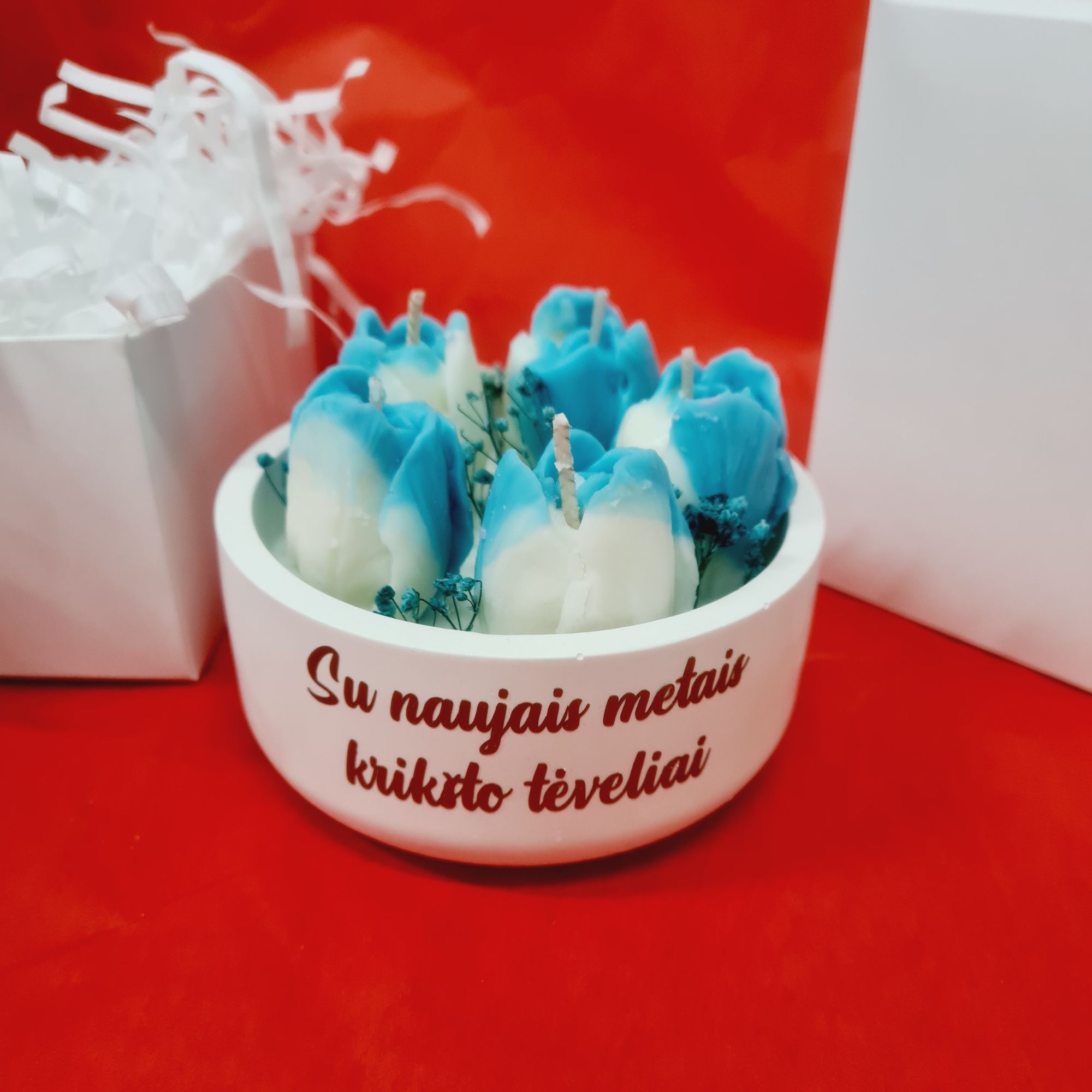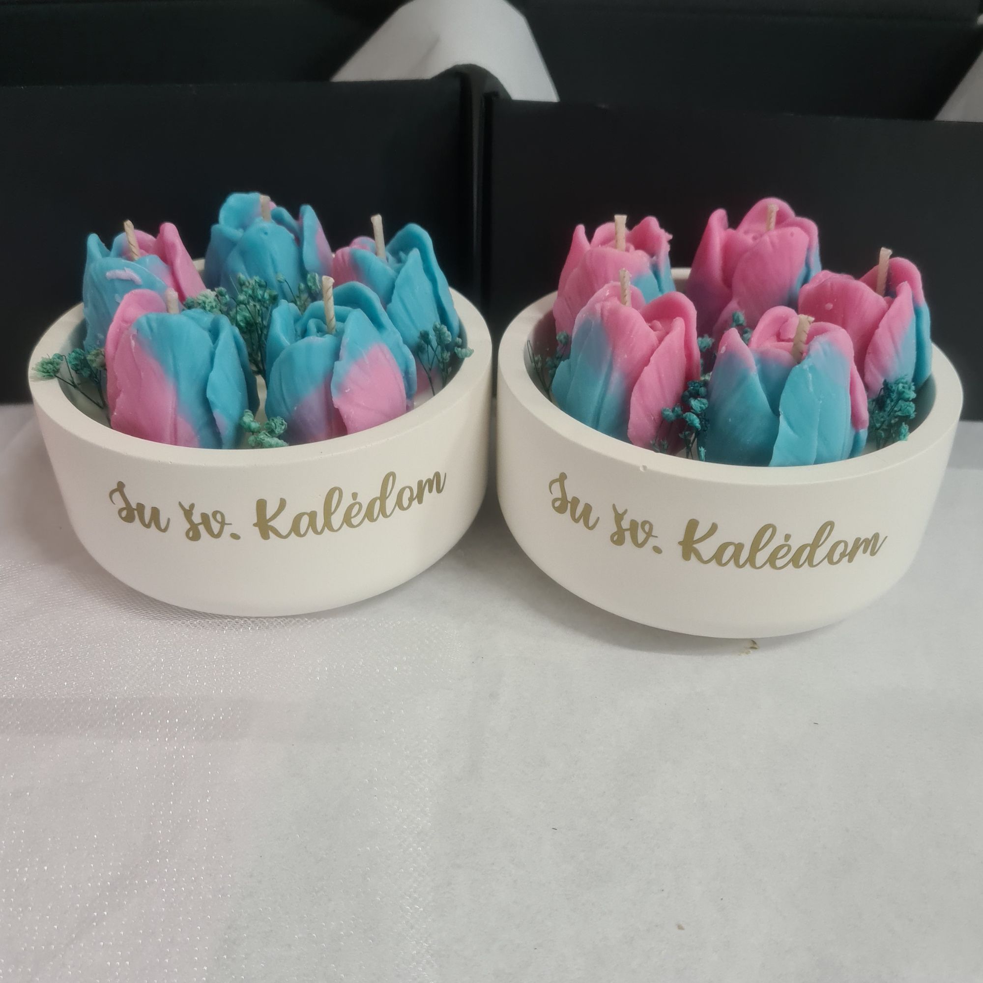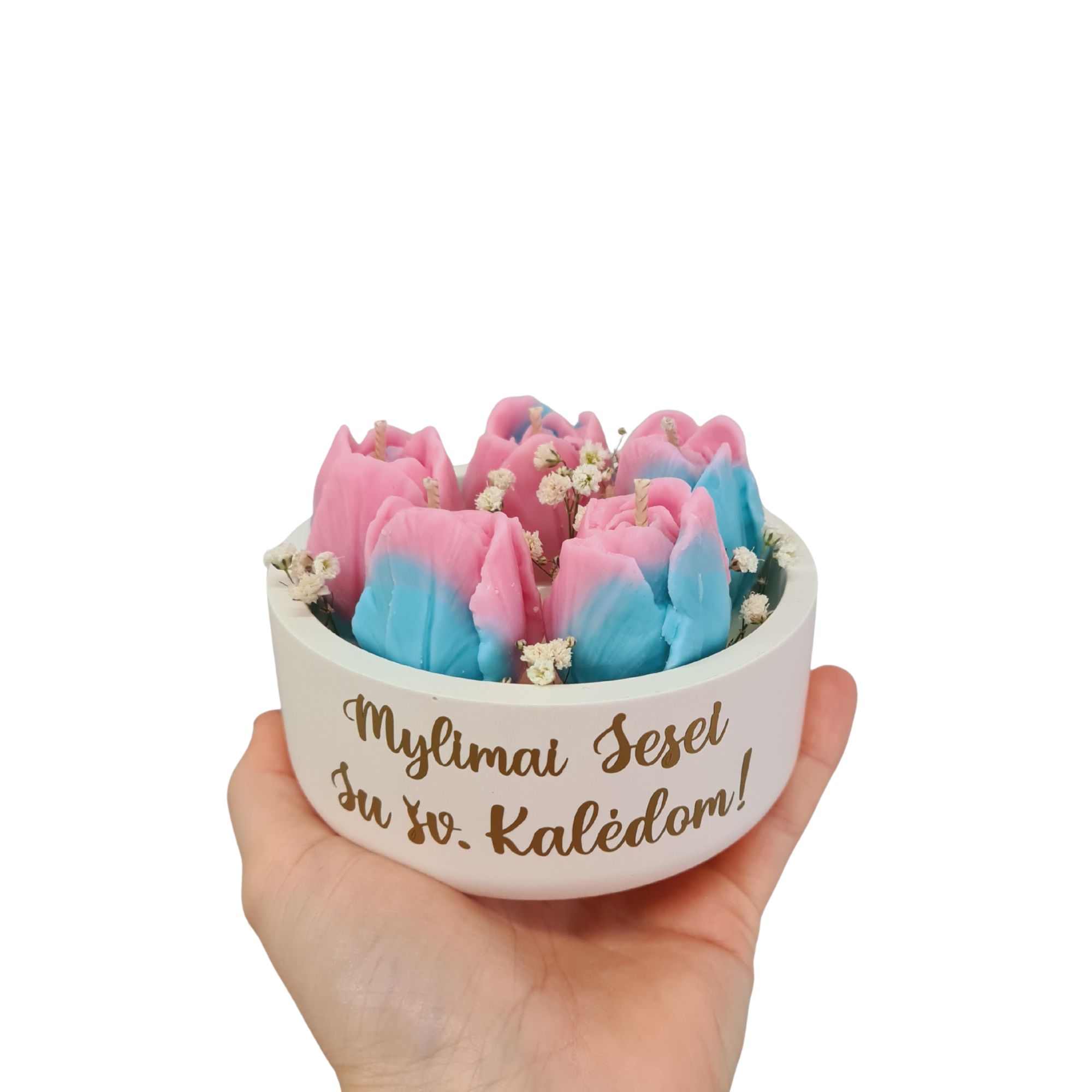 Ši rankų darbo žvakė „Tulpės su tekstu“ – šilta ir išskirtinė Kalėdų dovana, skirta mylimai moteriai. Kiekviena žvakė kuriama su meile, puošiama penkiais tulpių žiedais ir dailiai parinktomis sausomis gėlėmis, kurios suteikia natūralumo ir elegancijos.
