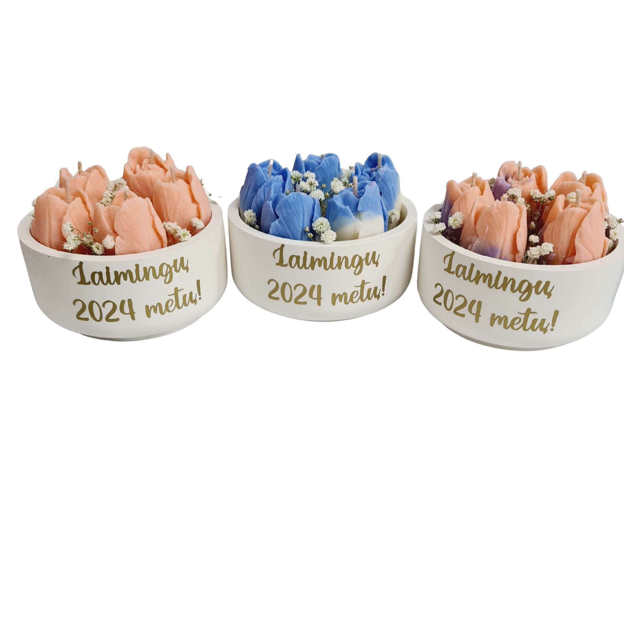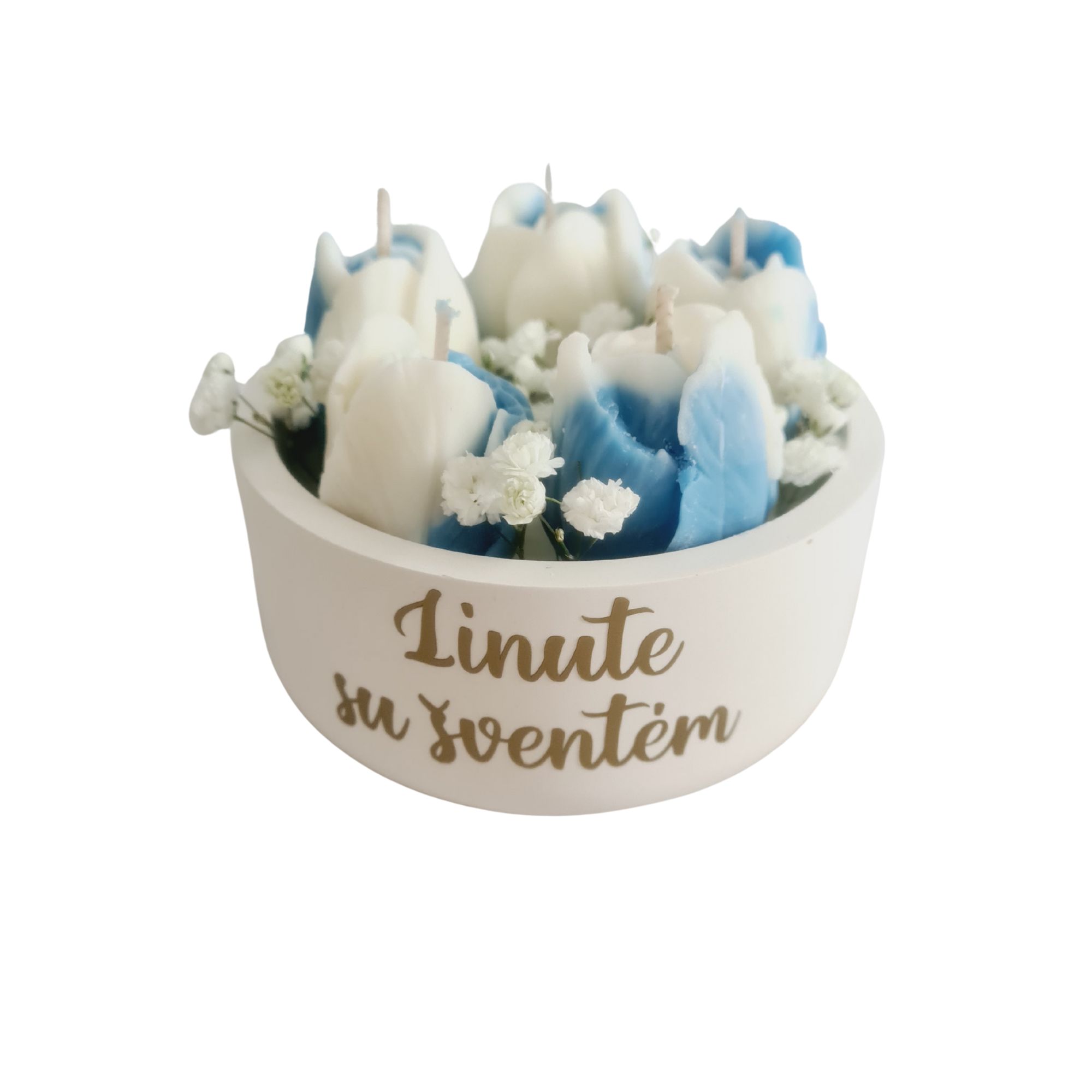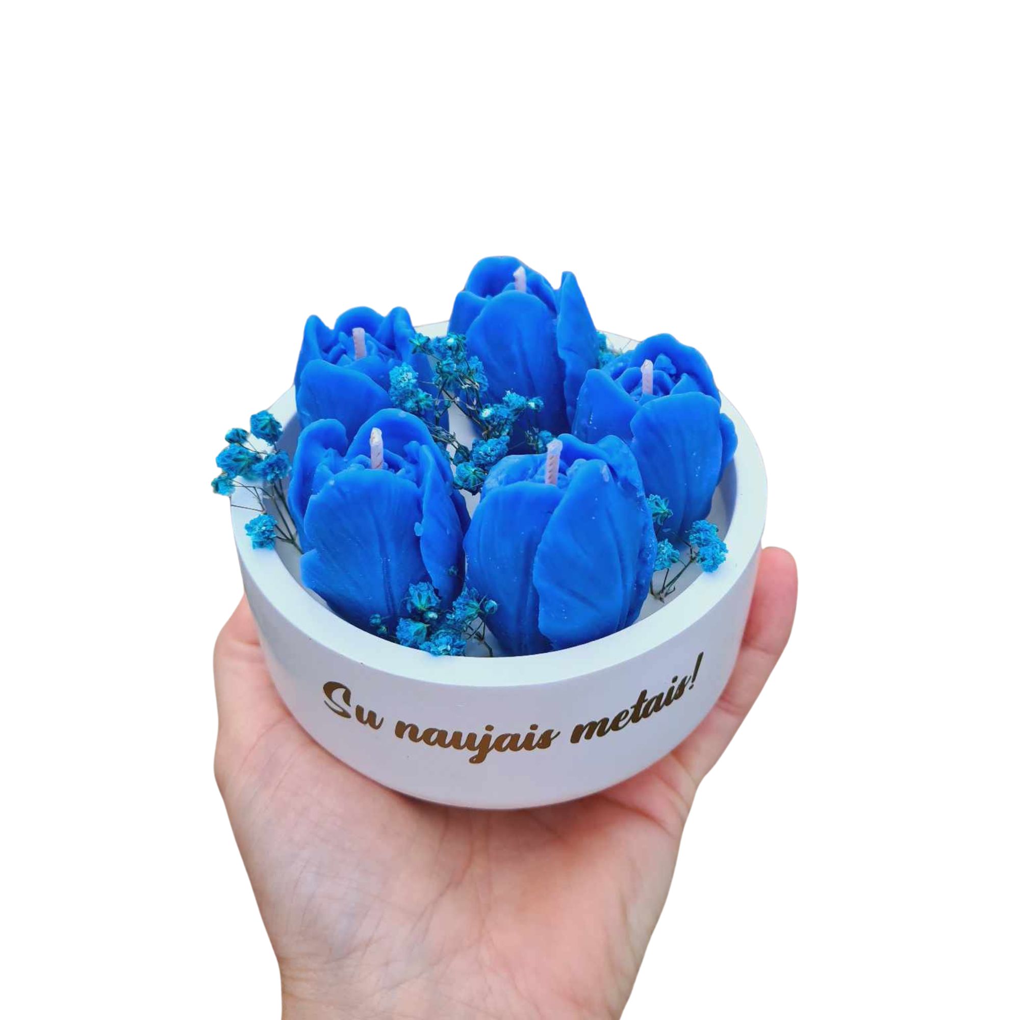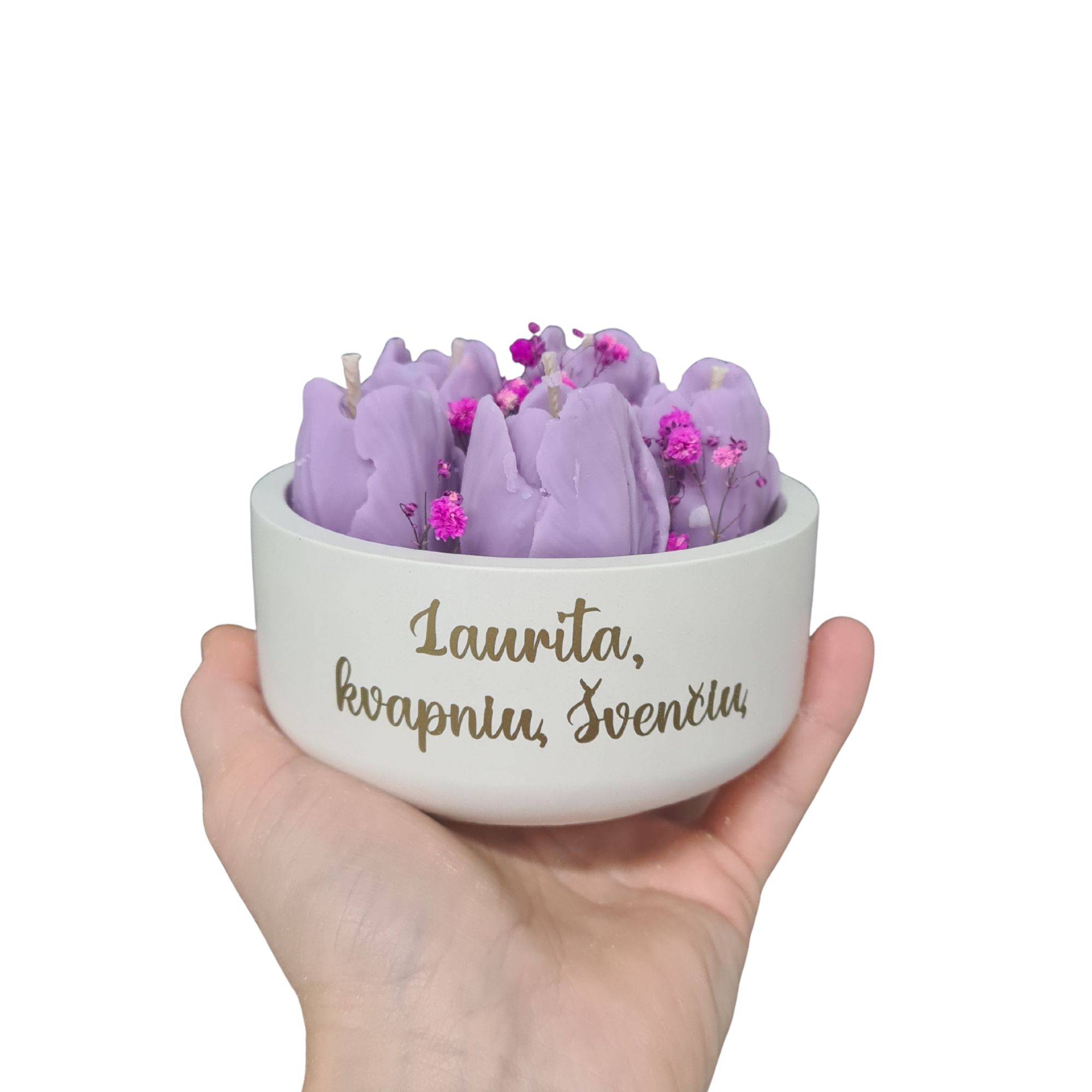 Ši rankų darbo žvakė „Tulpės su tekstu“ – šilta ir išskirtinė Kalėdų dovana, skirta mylimai moteriai. Kiekviena žvakė kuriama su meile, puošiama penkiais tulpių žiedais ir dailiai parinktomis sausomis gėlėmis, kurios suteikia natūralumo ir elegancijos.