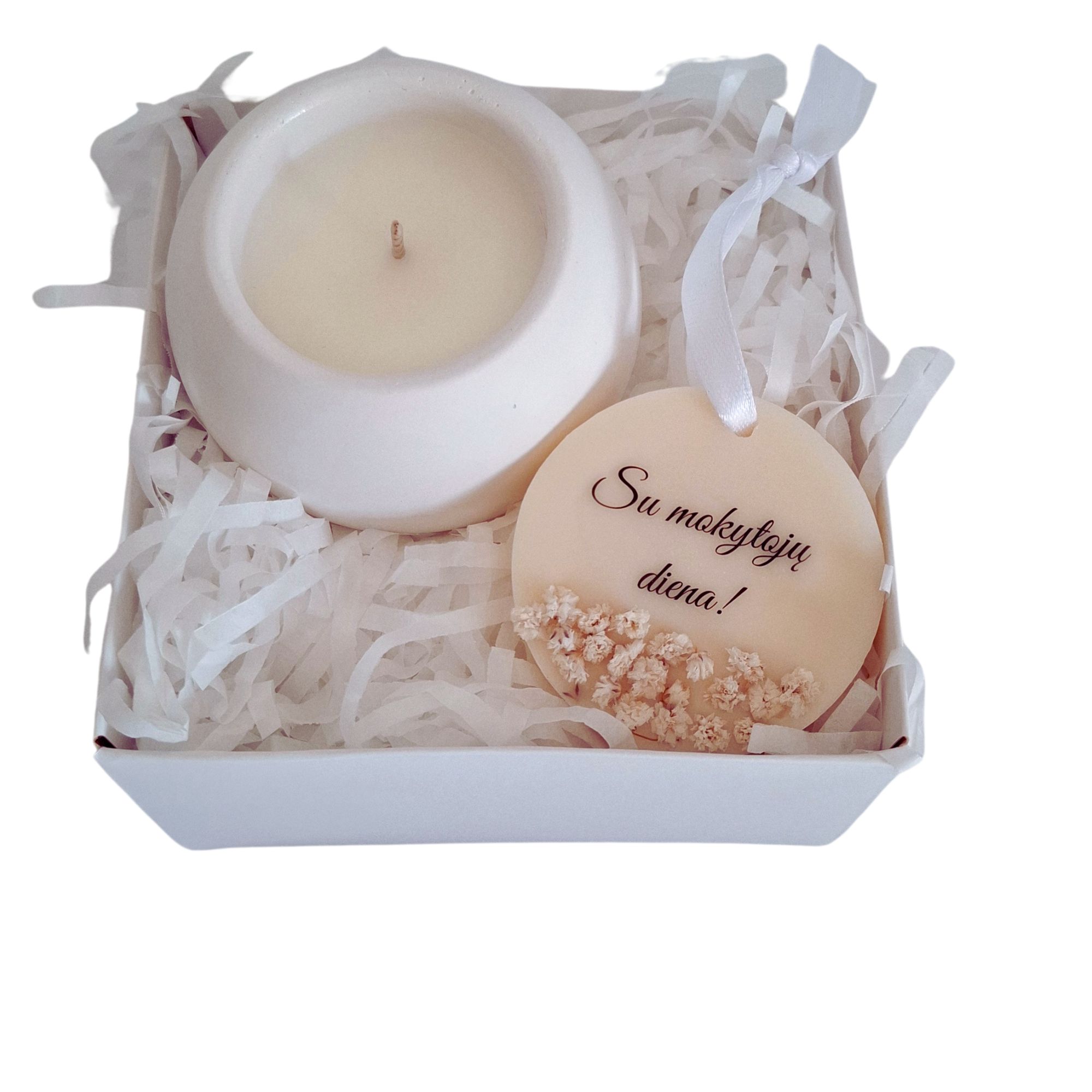 - Sojų vaško kvapukas su individualiu užrašu puoštas baltomis gėlytėmis. Užrašą parašykite į papildomą laukelį