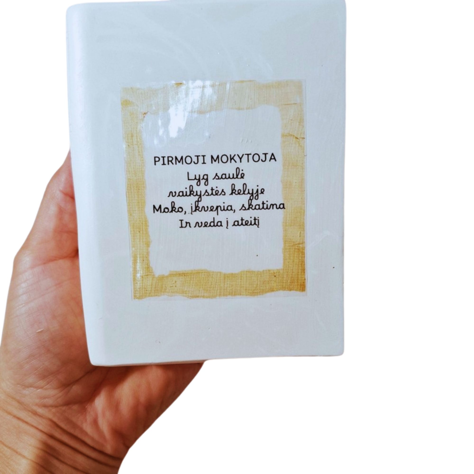 Ant dangtelio galima spausdinti pasirinktą tekstą, citatą ar palinkėjimą, todėl žvakė tampa išskirtinai personalizuota dovana mokytojai, knygų mylėtojui ar kolegai.