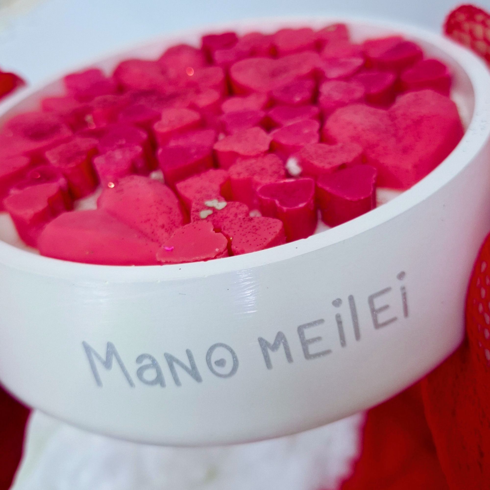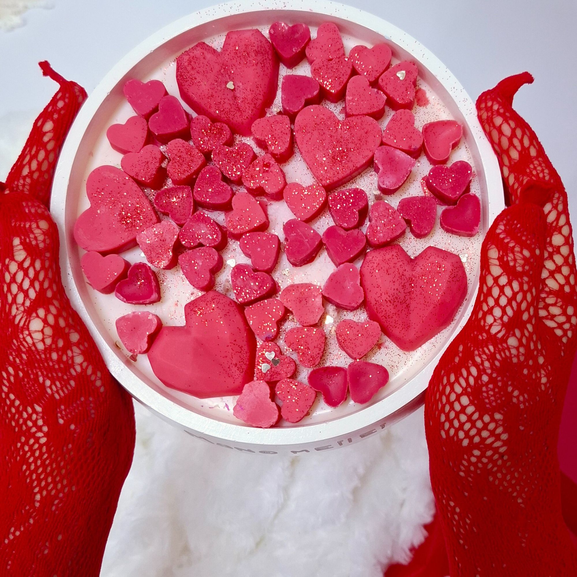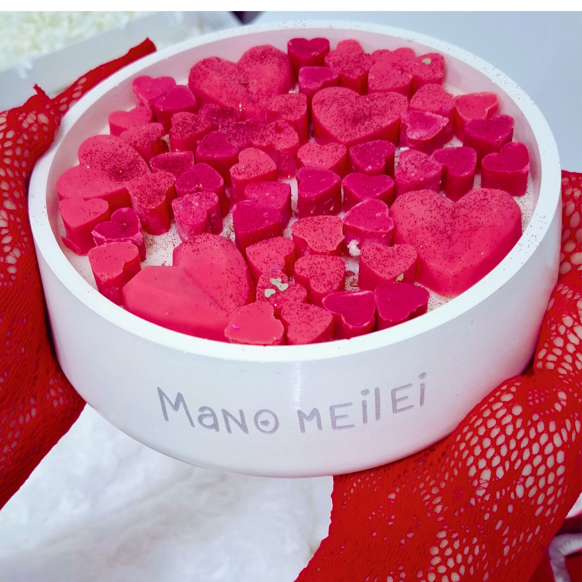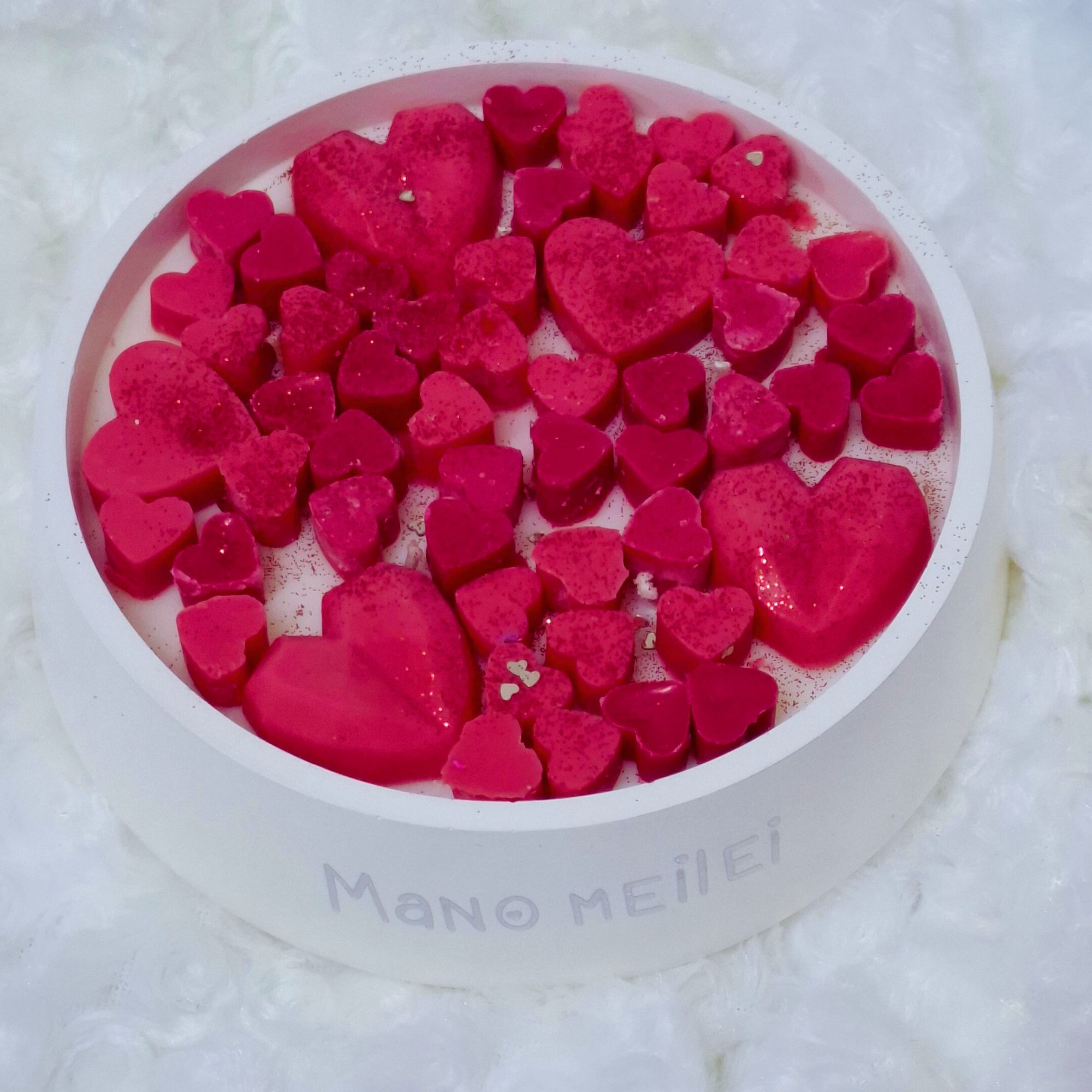 Rankų darbo žvakė dovana Valentino dienai papuošta širdelėmis. Šios rankų darbo kvapnių širdelių žvakė – tai daugiau nei dovana. Tai jausmas.