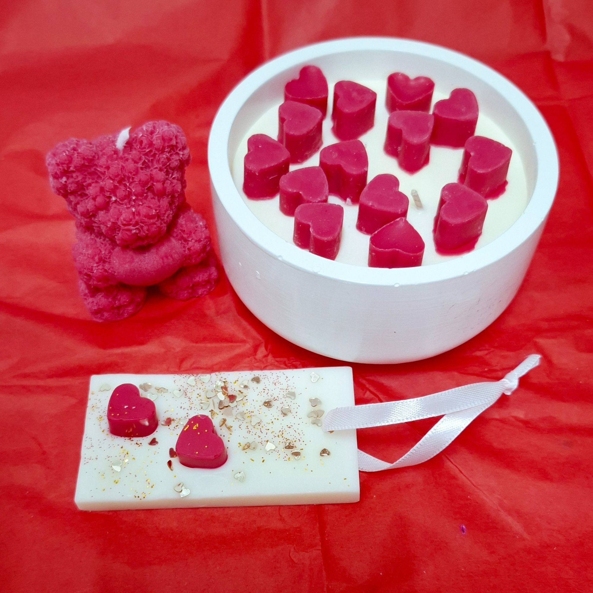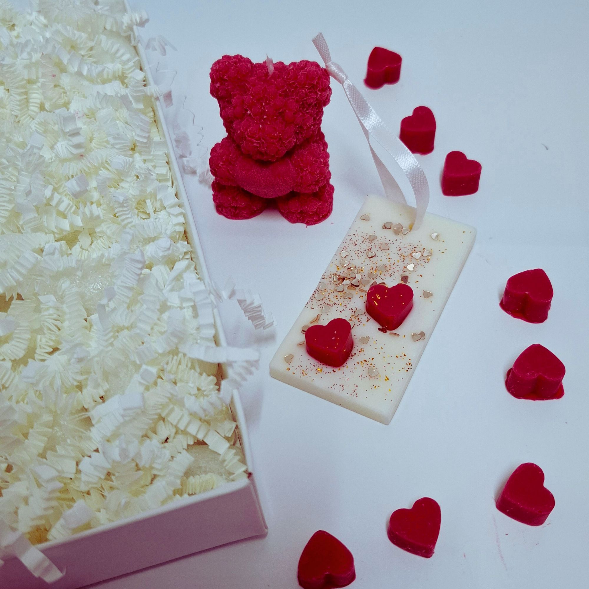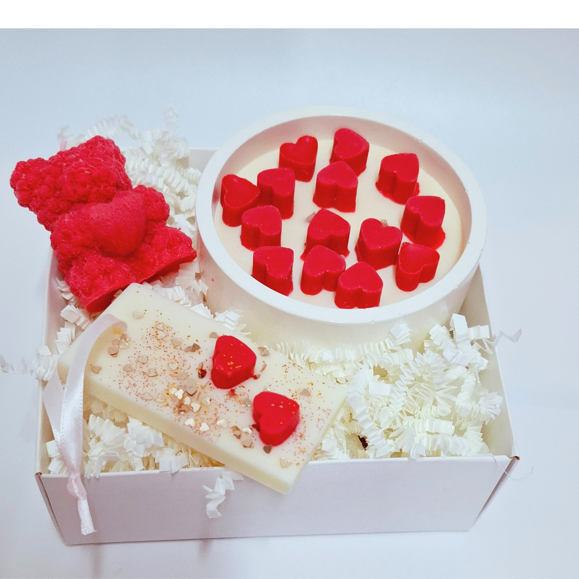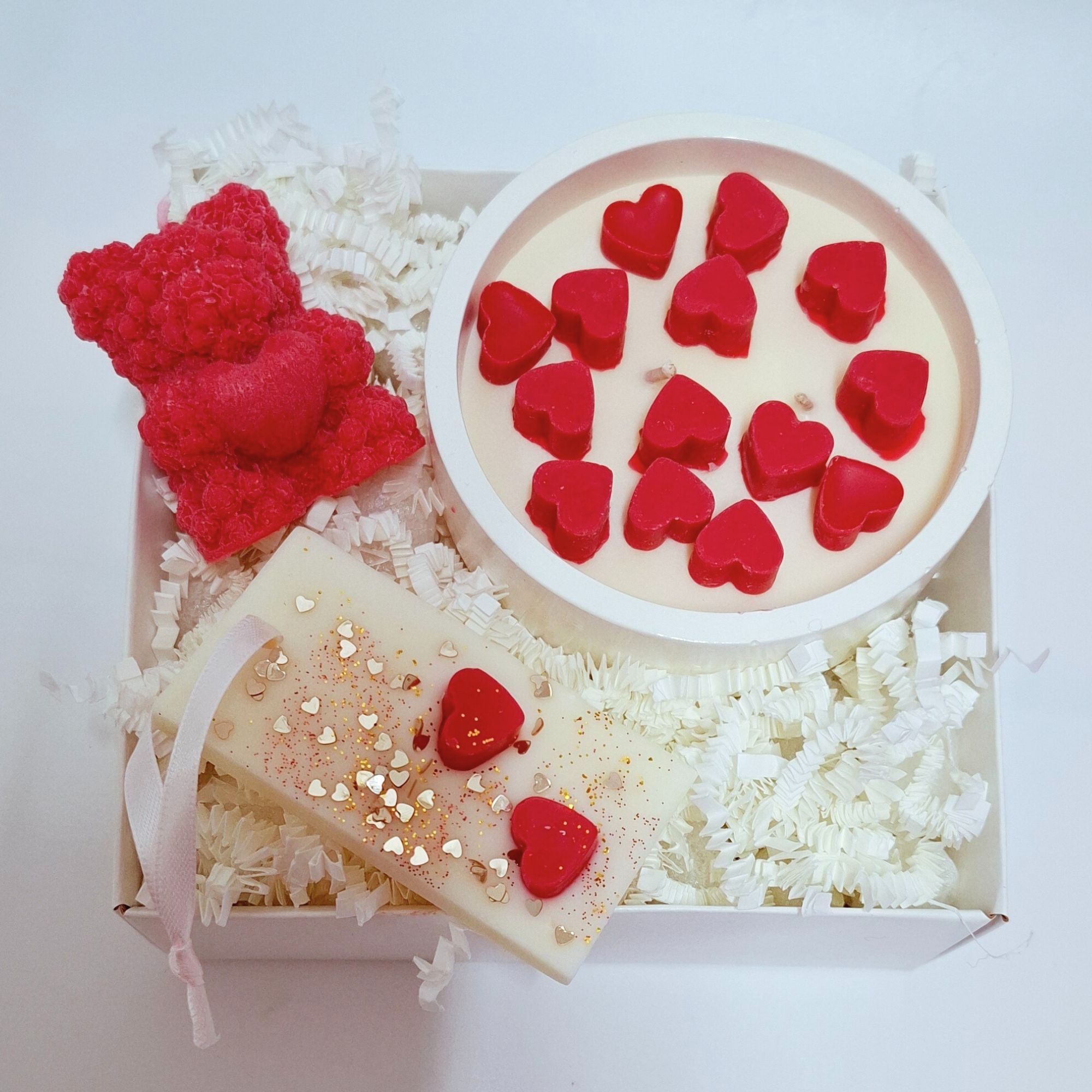 Šis dovanų rinkinys sukurtas tiems, kurie nori dovanoti emociją, jaukumą ir šilumą. Rinkinyje rasite rankų darbo kvapnią žvakę, dekoruotą raudonomis širdelėmis, sausą kvapą iš vaško  bei žvakę meškiuką.