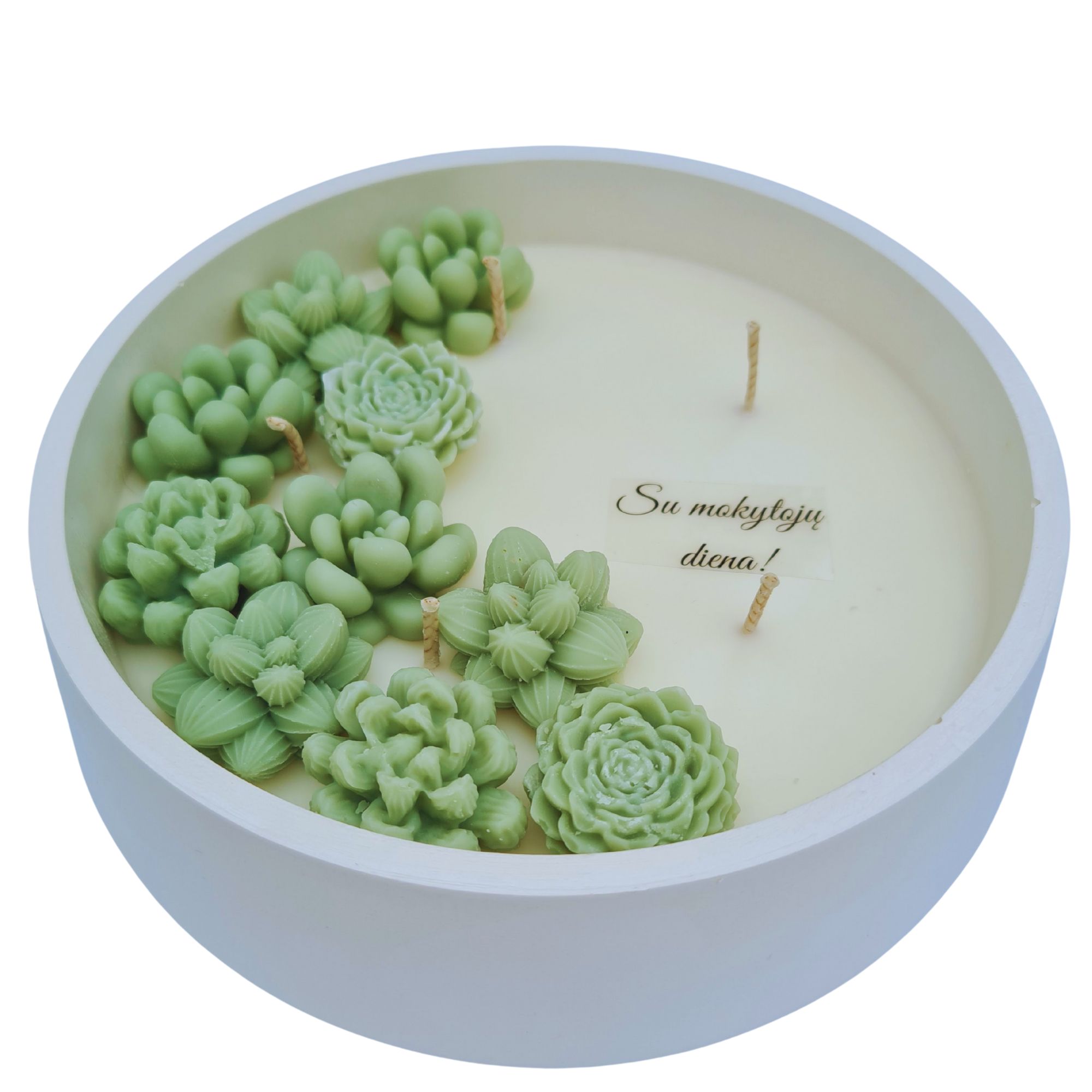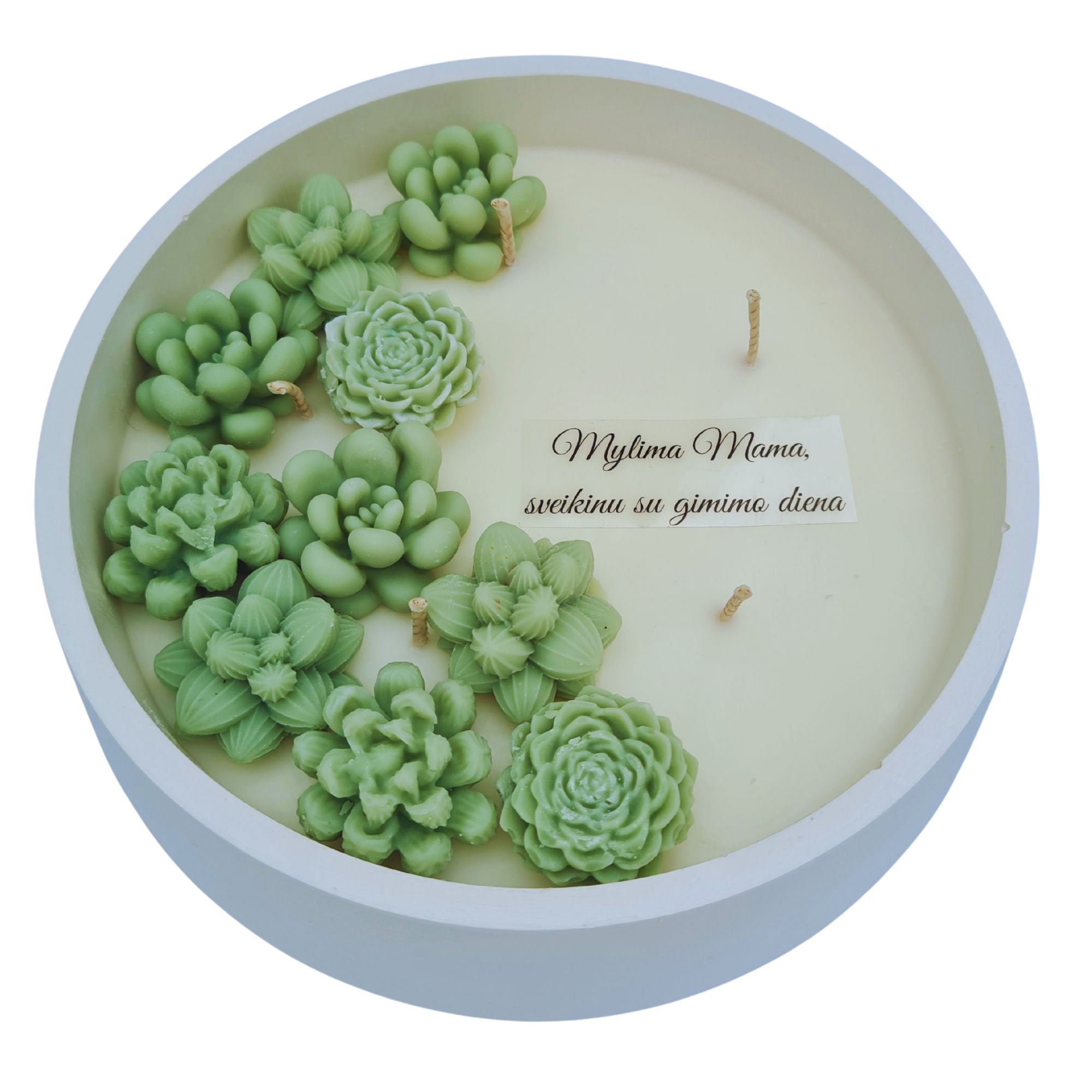 Rankų darbo sojų vaško žvakė Sukulentai su palinkėjimu