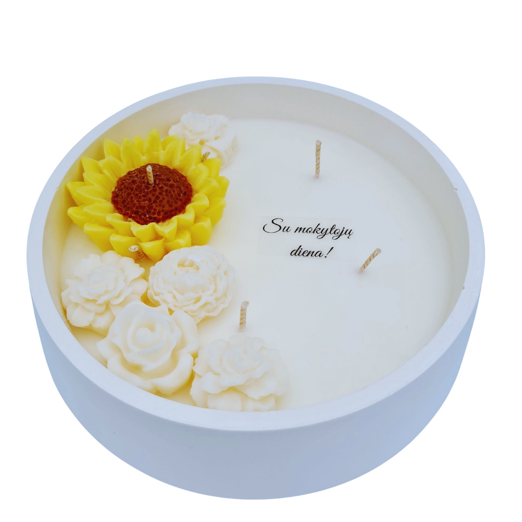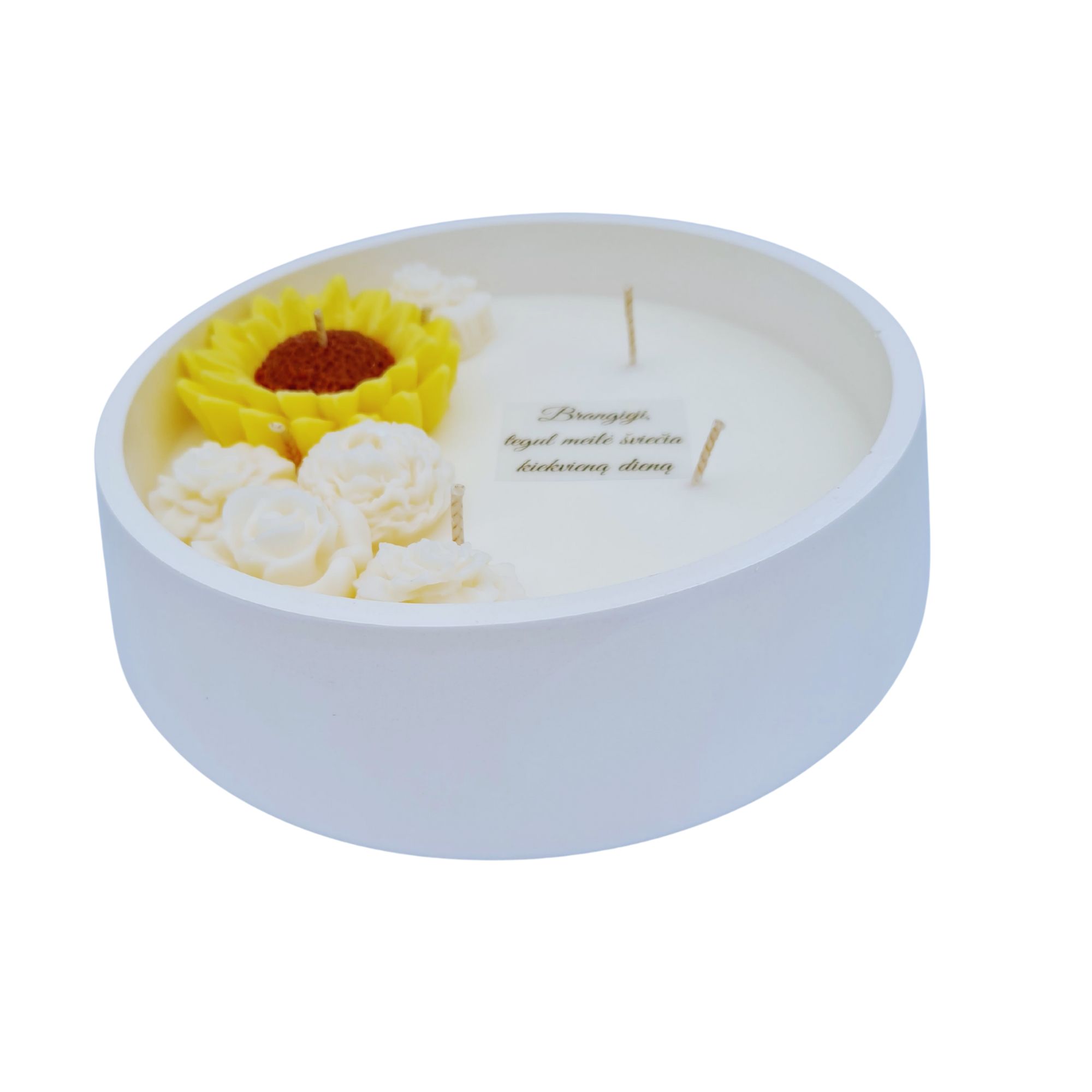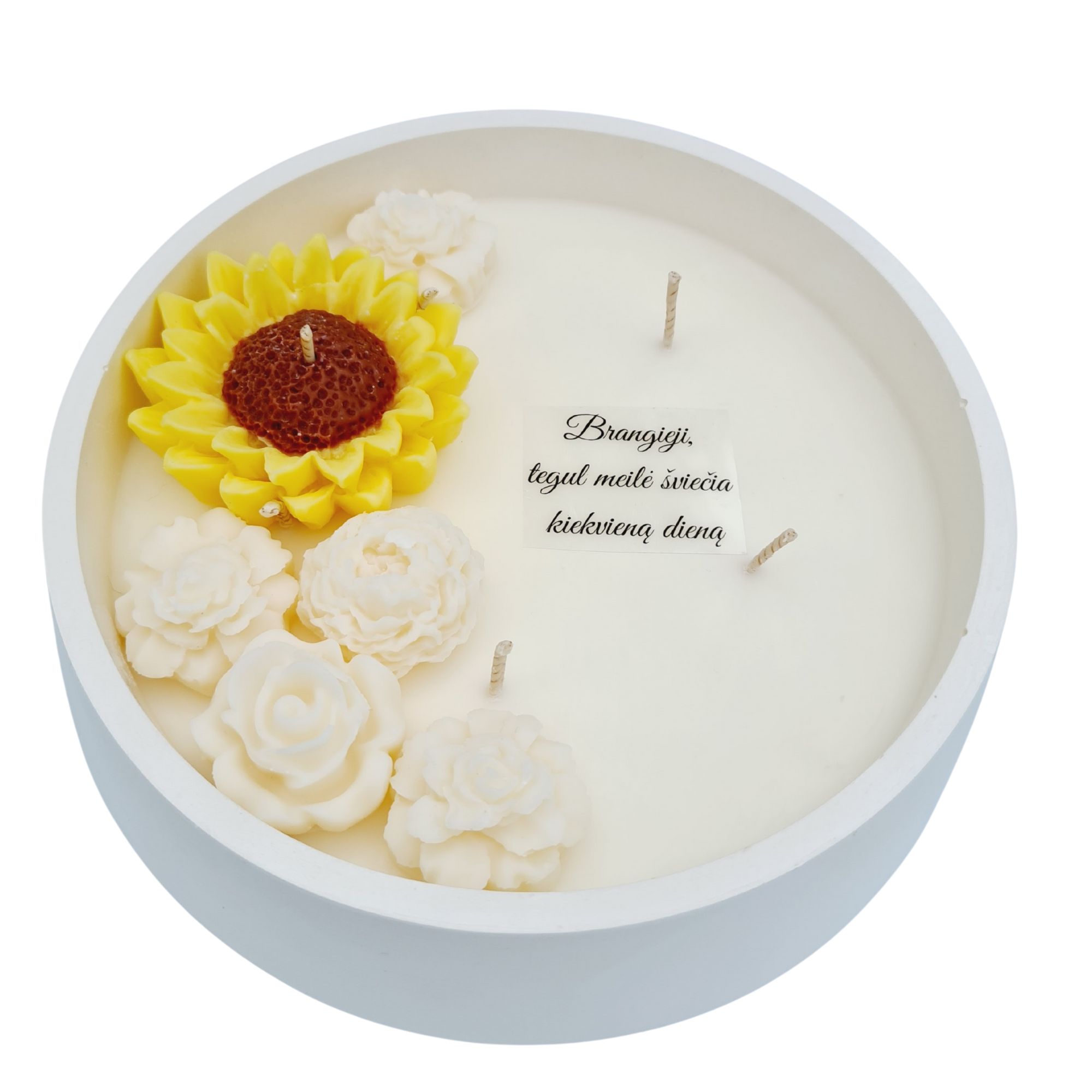 Išskirtinė rankų darbo sojų vaško žvakė, papuošta saulėgrąža ir gėlėmis. Centre – vieta jūsų pasirinktai žinutei, todėl ši žvakė tampa ypatinga ir asmeniška dovana. Dovana tinka tiek savo namams papuošti, tiek dovanai, žvakę personalizavus.