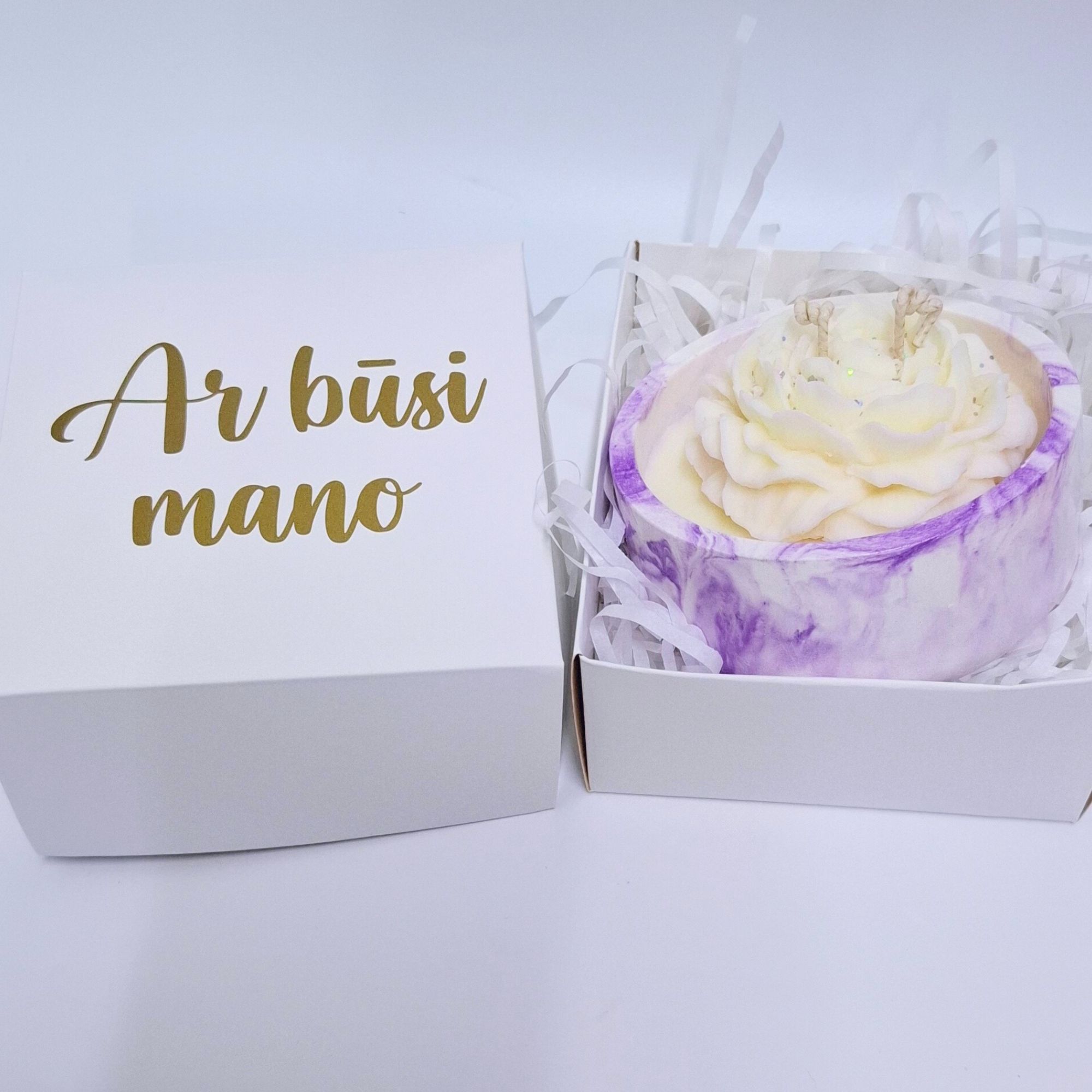 Supakuota baltoje dėžutėje, perrišta baltu kaspinu.