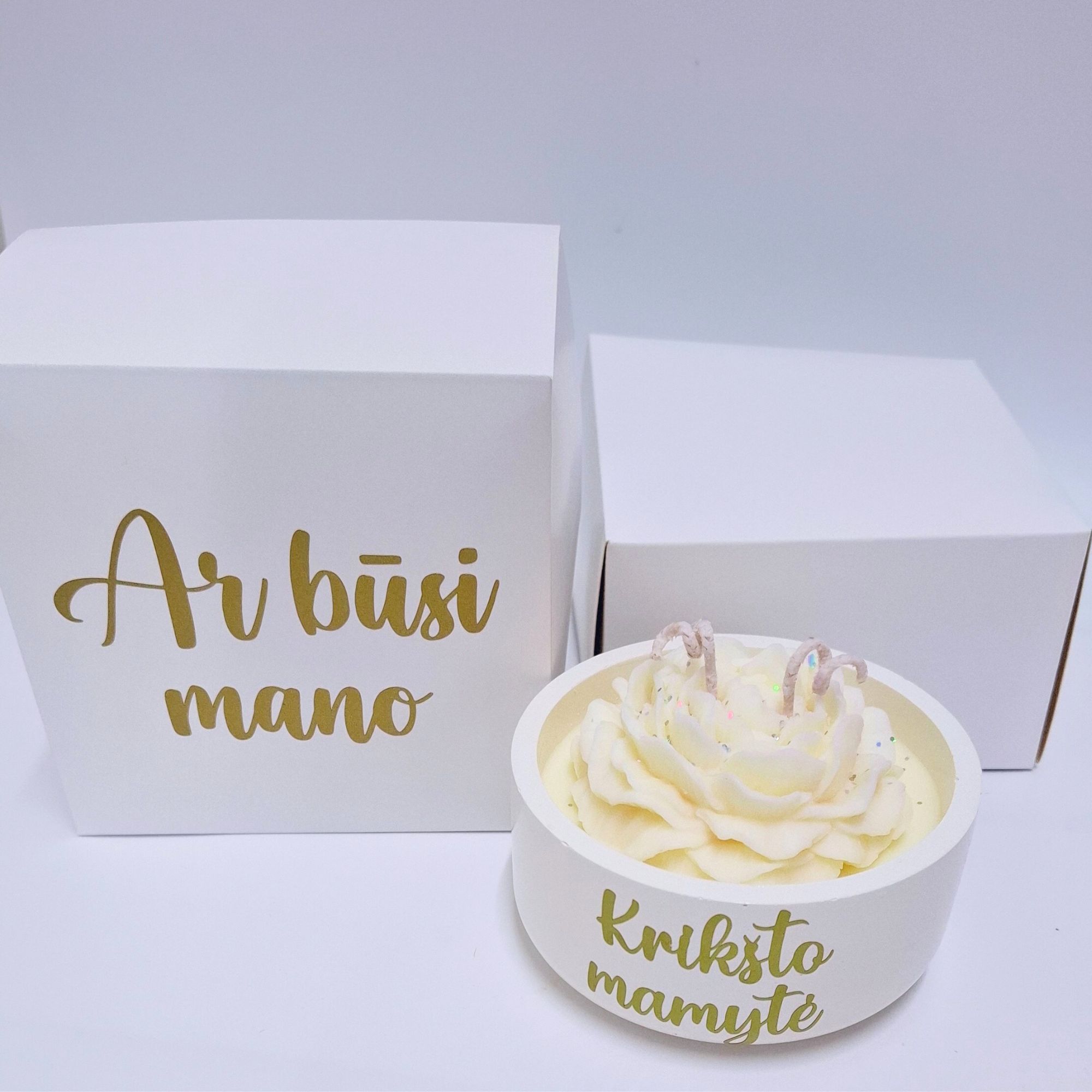 Kvietimas gali būti personalizuotas, jei norite pridėti savo žodžius, įrašykite juos į papildomą laukelį. Taip pat galimas individualus tekstas ant dėžutės arba žvakės.