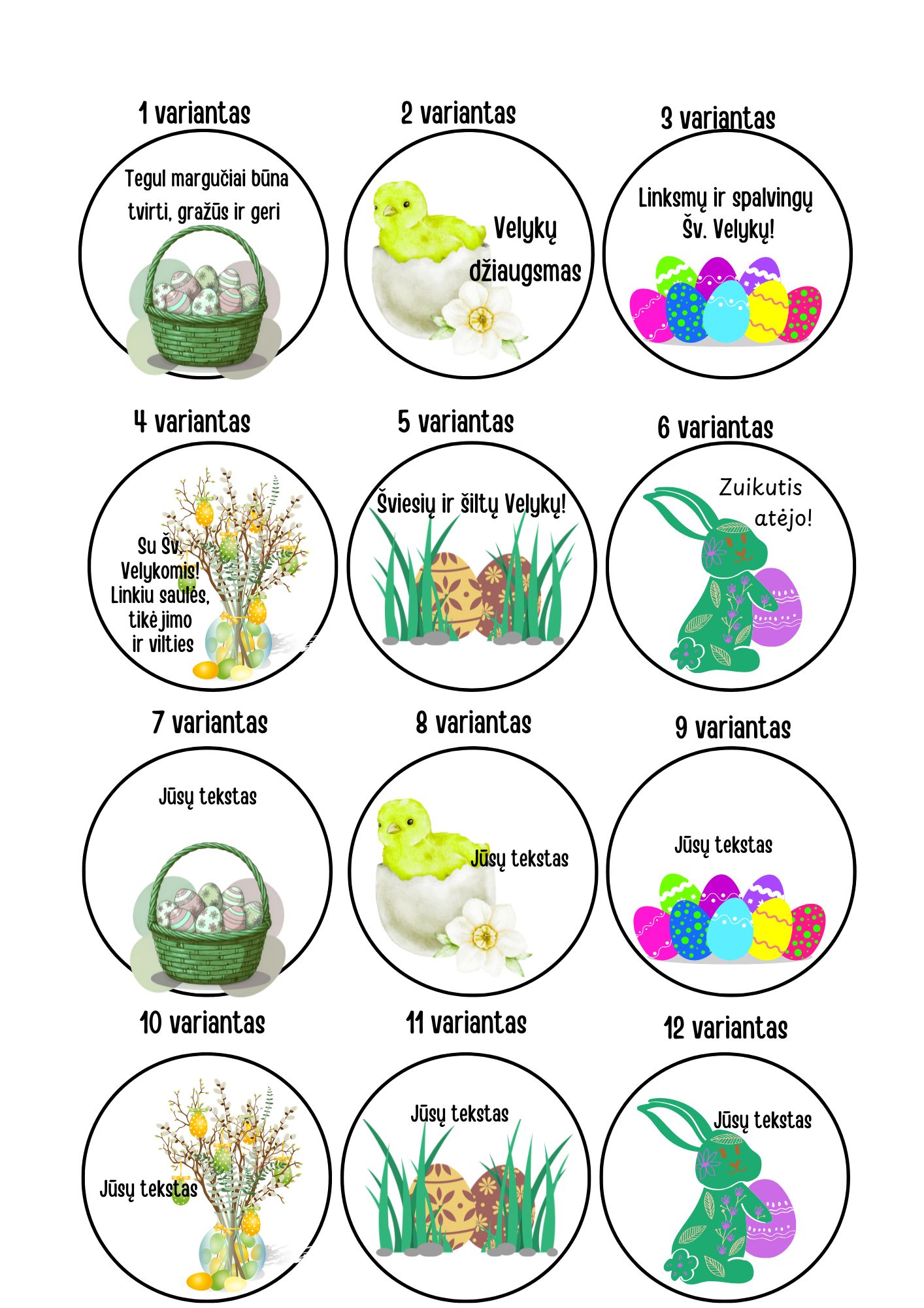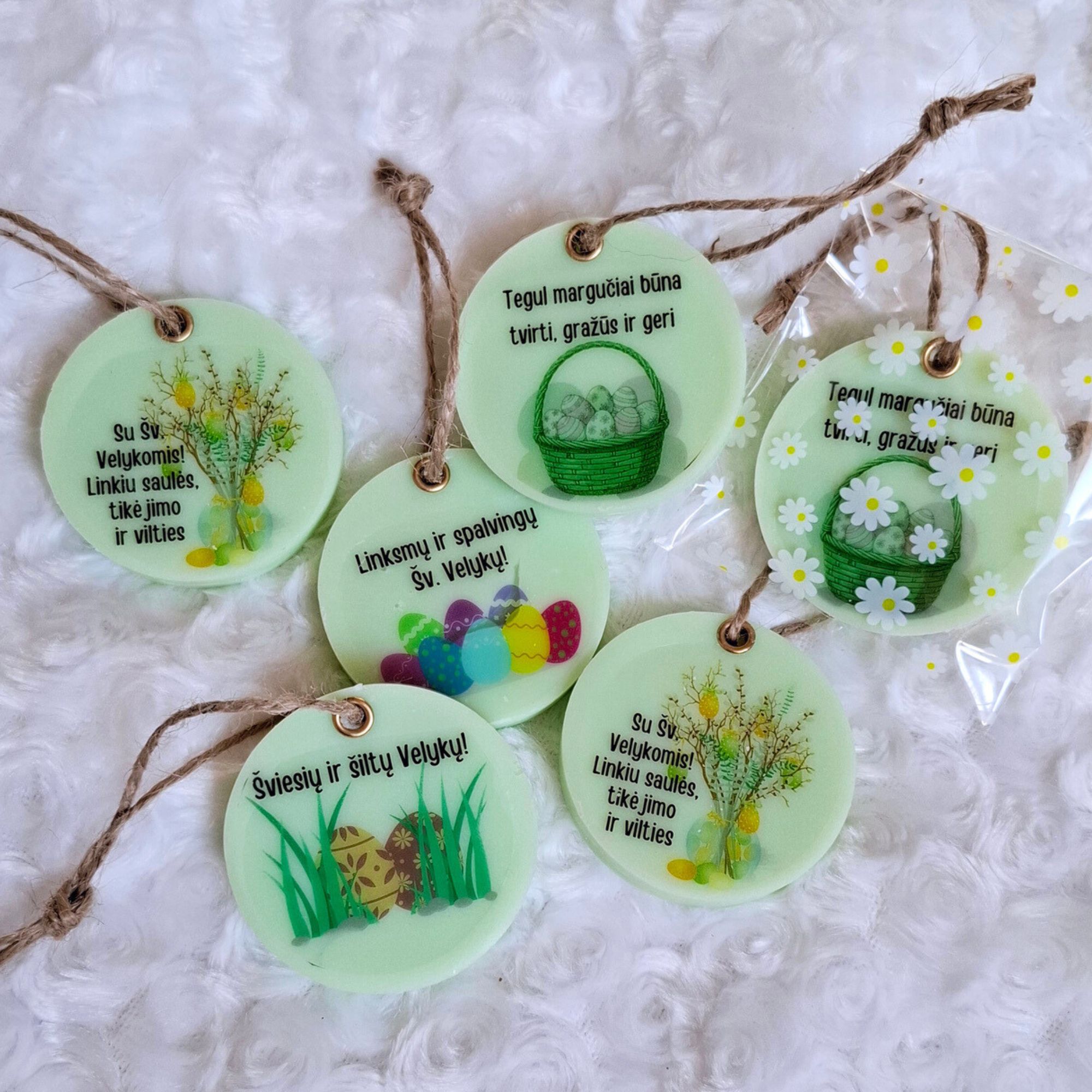 Velykiniai kvapukai su spauda – tai rankų darbo sojų vaško kvapukai, sukurti šventinei atmosferai namuose ar darbo vietoje. Kiekvienas kvapukas yra apvalus, 6 cm skersmens, rankų darbo, todėl kiekvienas gaminys yra unikalus. Ant kvapuko galima įrašyti personalizuotą užrašą, pavyzdžiui, vardą ar palinkėjimą, todėl tai tampa išskirtine Velykų dovana artimam žmogui.