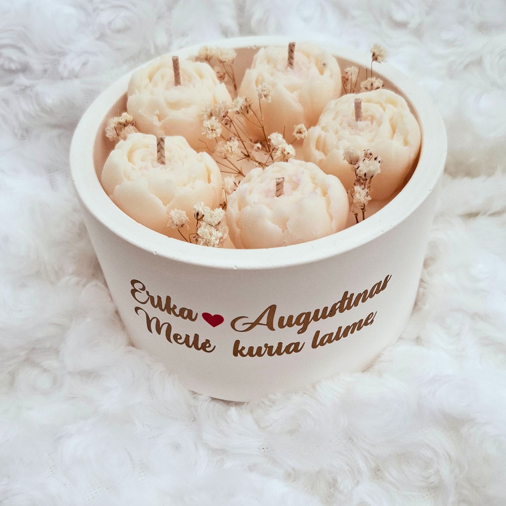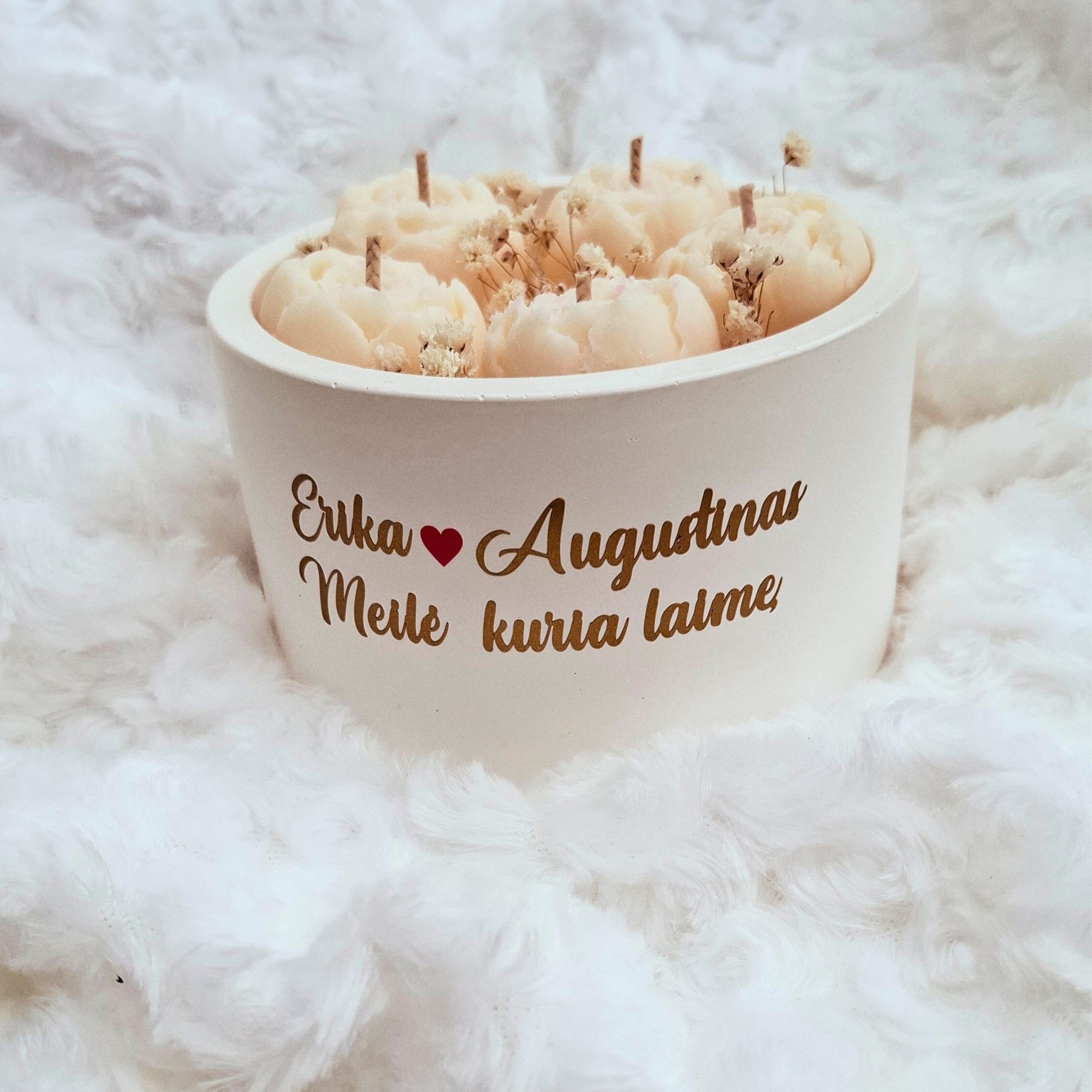 Nuostabi rankų darbo dovana jauniesiems vestuvių proga ir ne tik. Rankomis išlietas indelis, apgalvota kiekviena žvakės detalė.