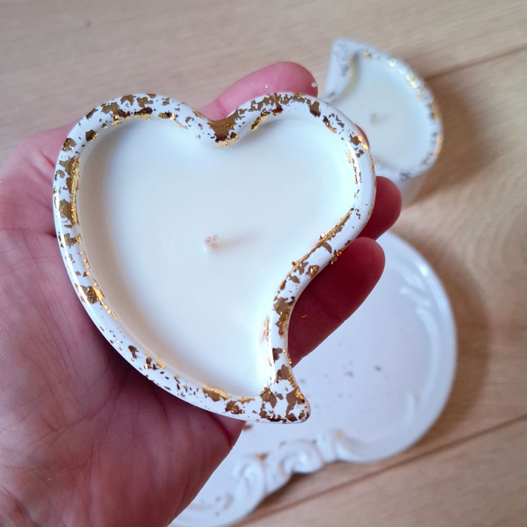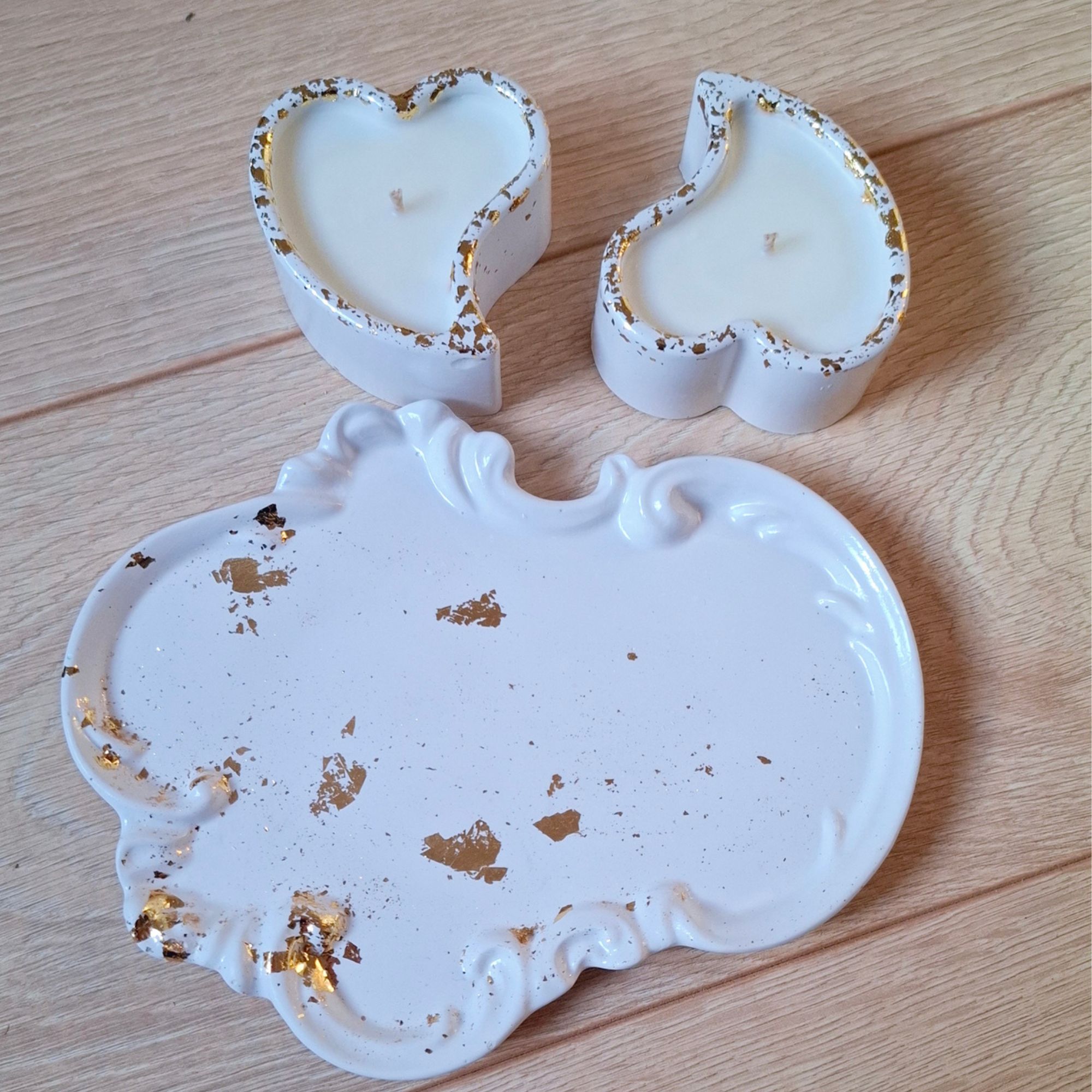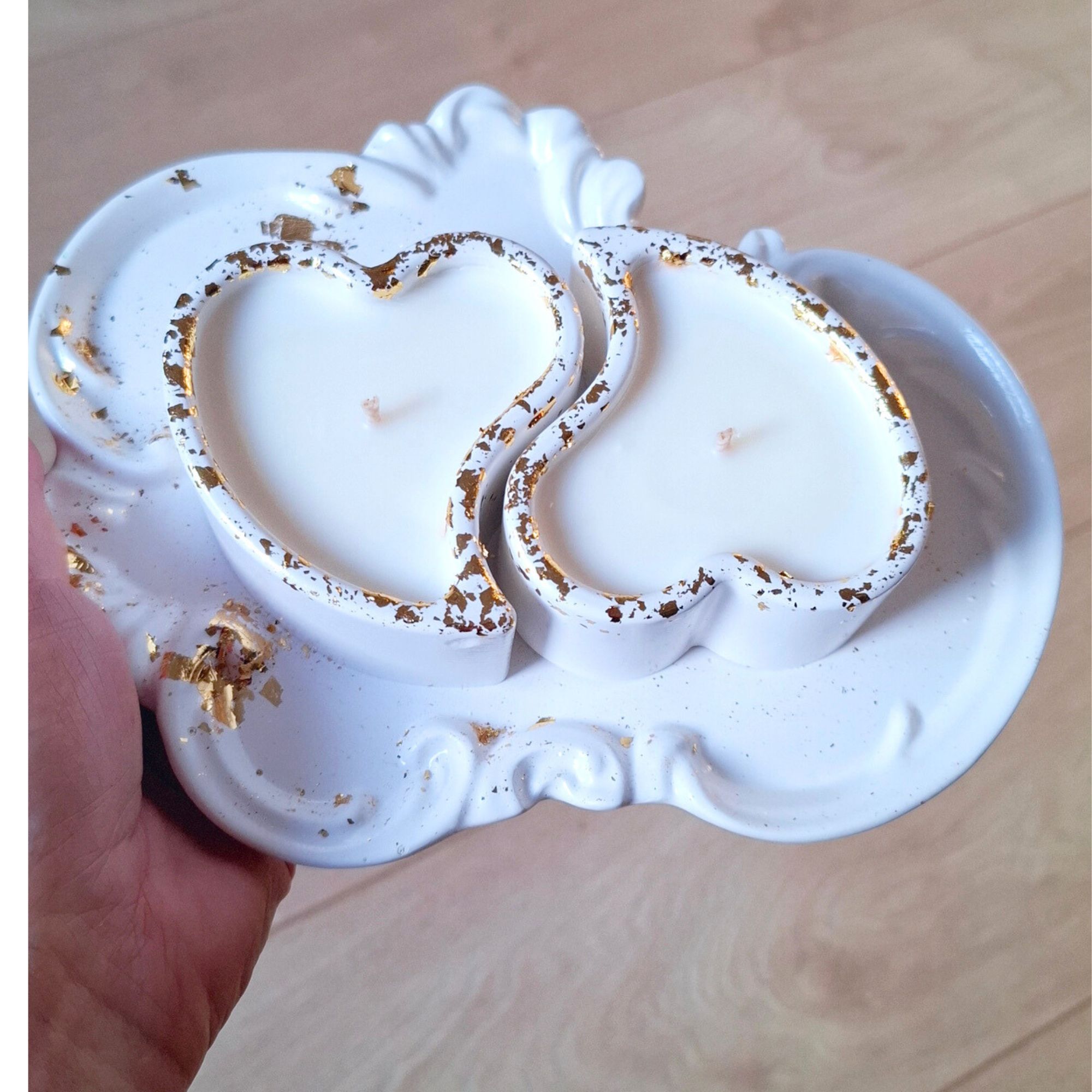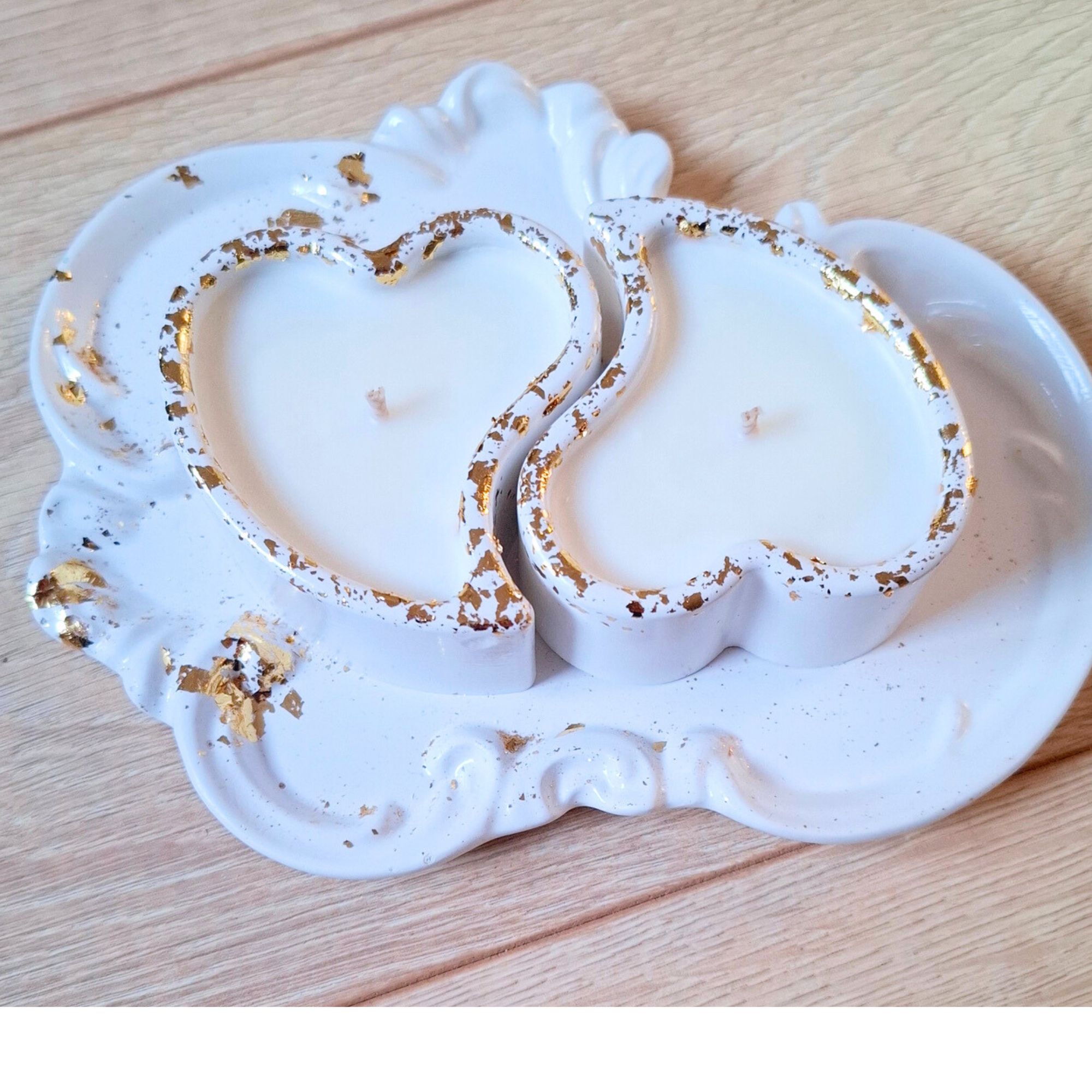 Ši elegantiška dviejų širdelių žvakių rinkinys su dekoratyviniu padėklu simbolizuoja meilę, artumą ir ryšį. Subtilūs aukso akcentai suteikia prabangos pojūtį ir išskirtinumo.