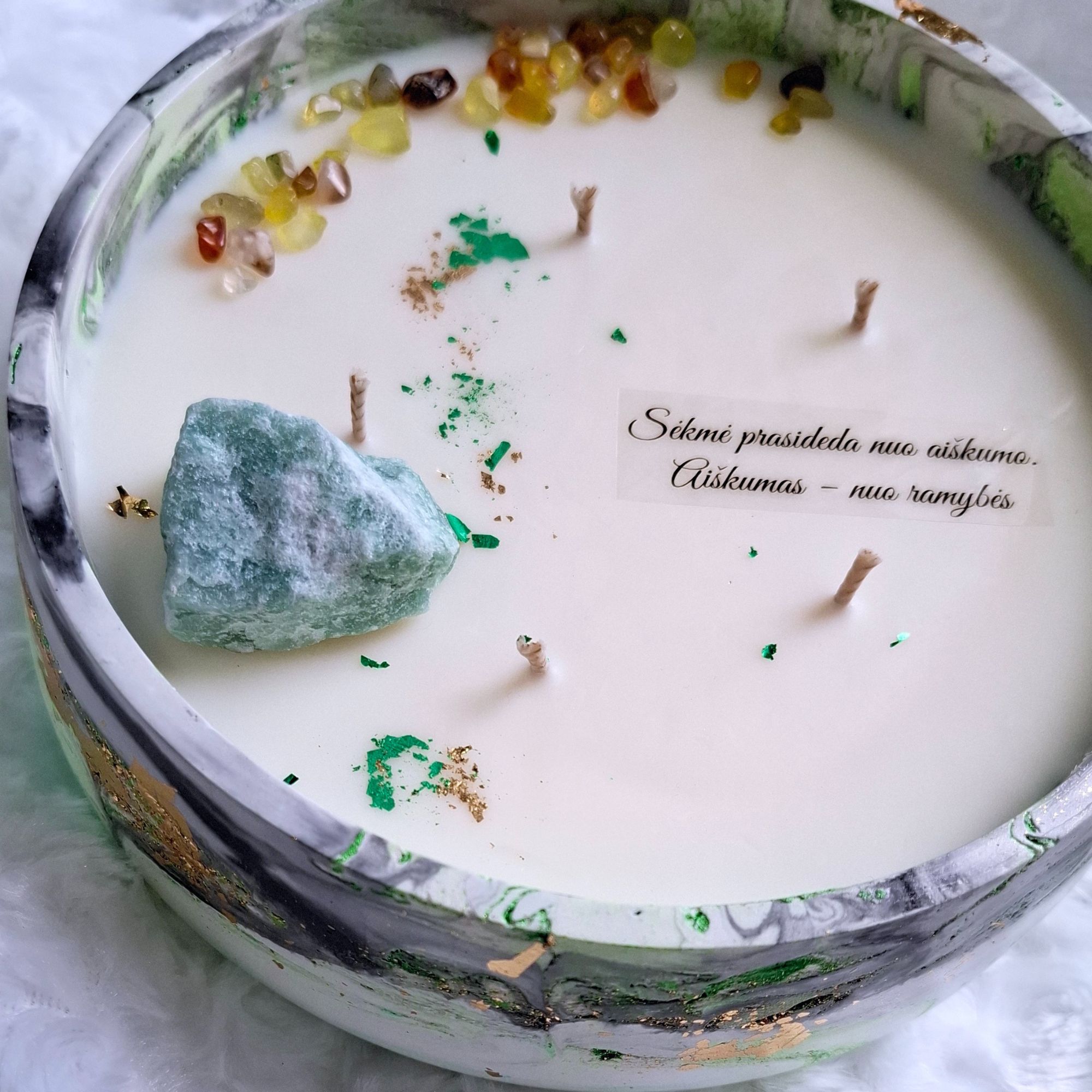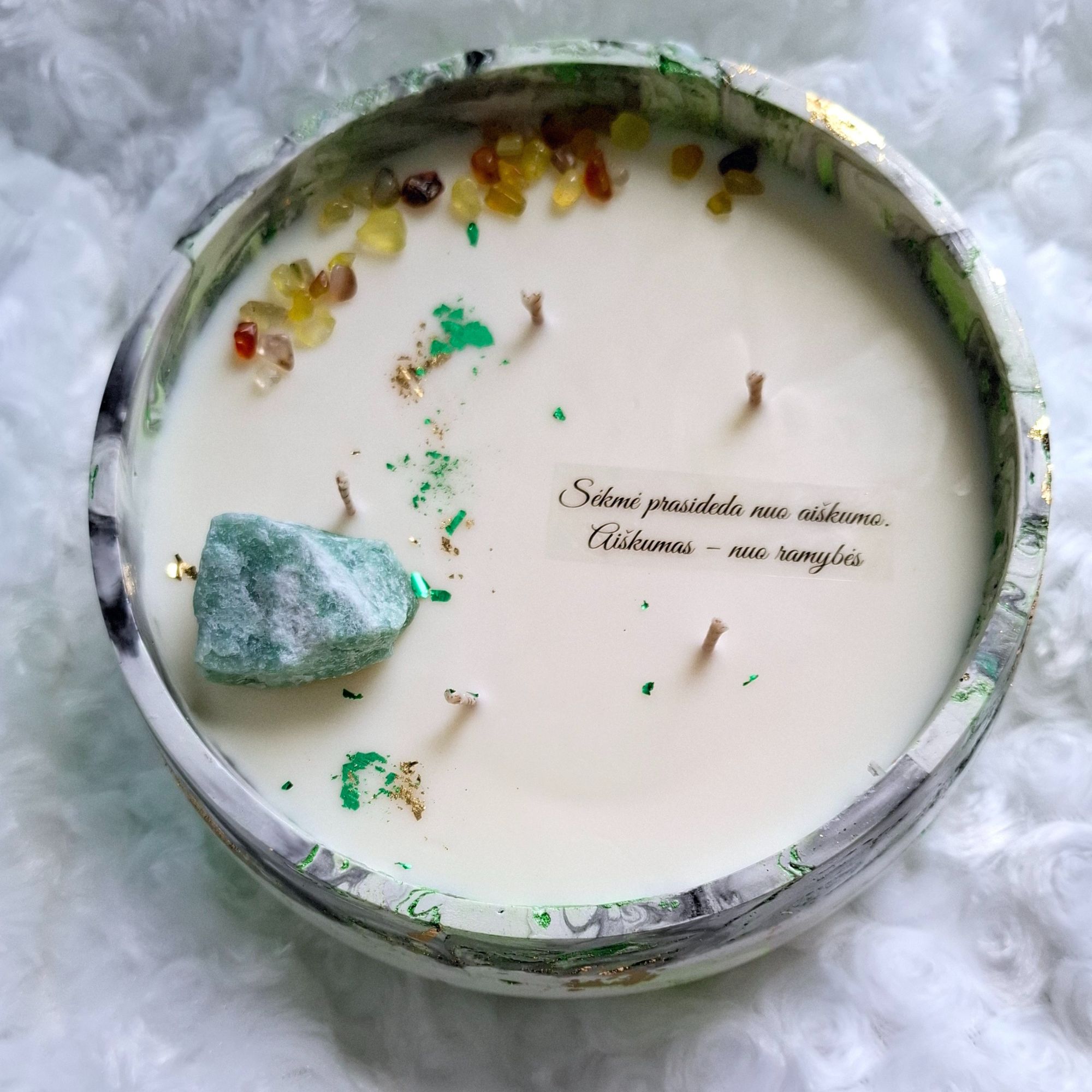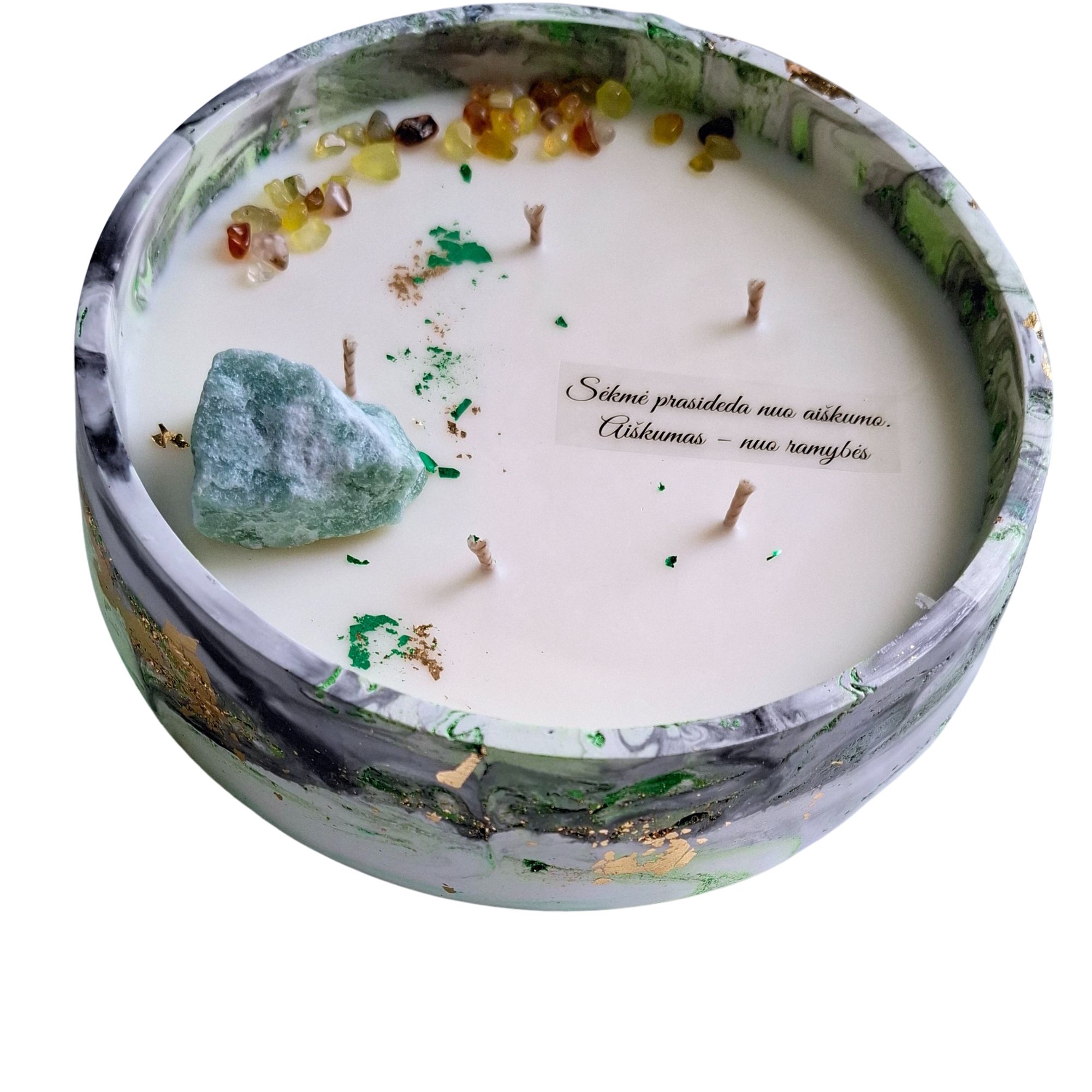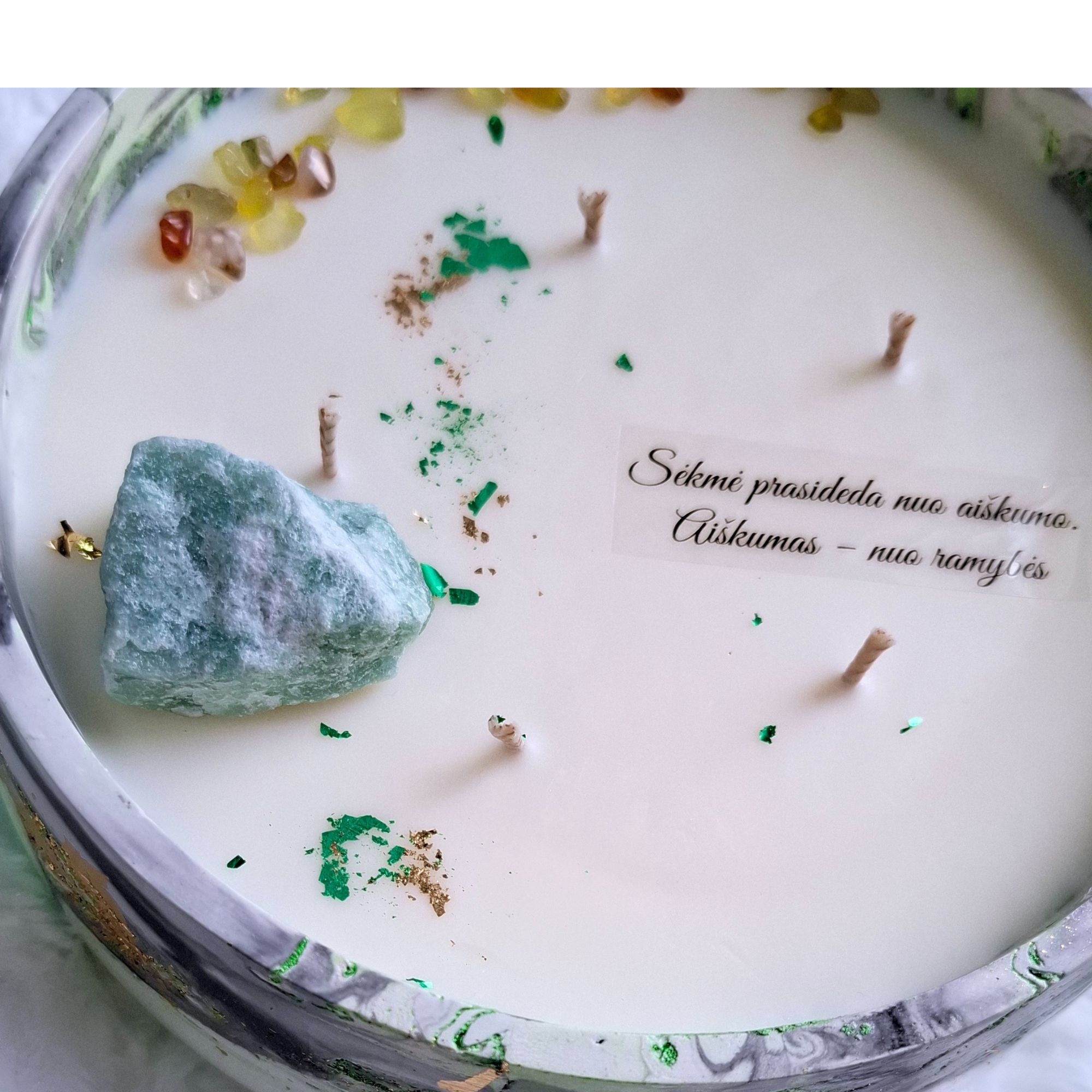 Ant žvakės esantis užrašas įkvepiantis palinkėjimas apie sėkmę, naują pradžią ar tikėjimą savo keliu – puikus akcentas dovanojant ją kaip simbolinę dovaną.